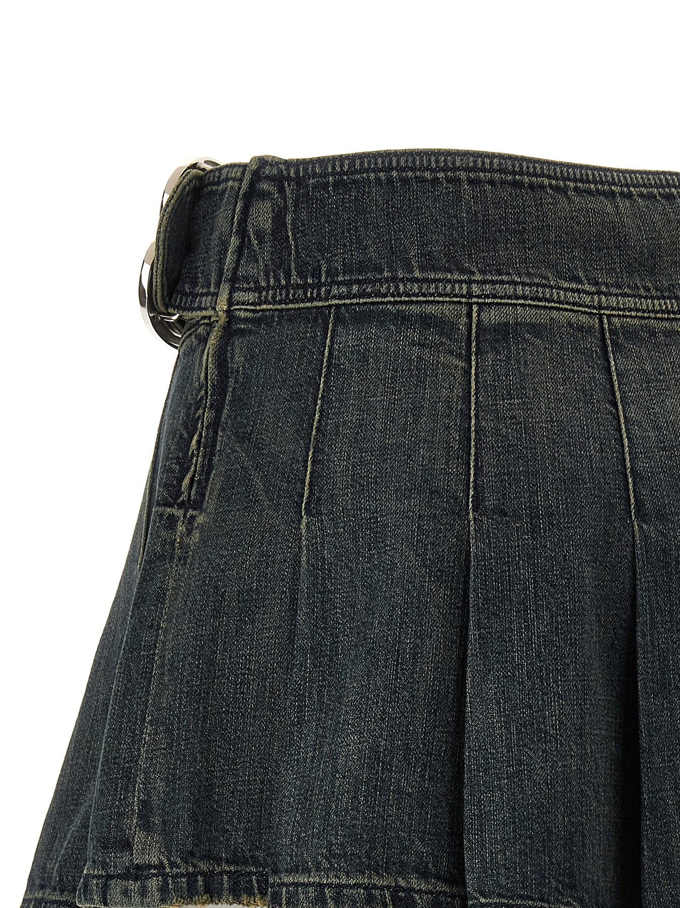 'Buckle Pleated' flared and pleated skirt in stonewashed stretch cotton denim with side zip closure, belt with maxi metal logo buckle.