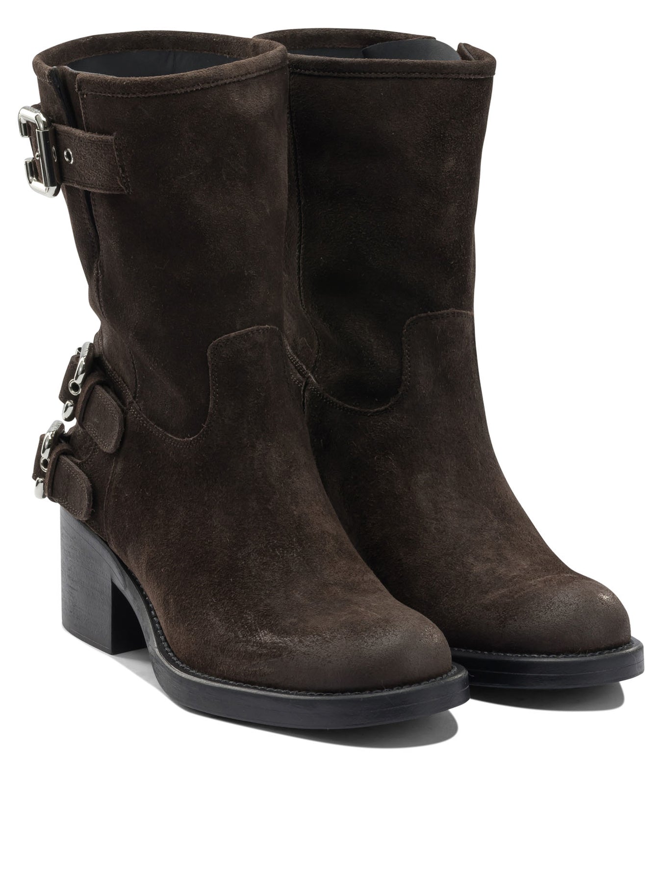 Chloé's "Dakota" 60mm ankle boots, made of suede calfskin, feature a low tubular construction with a biker-inspired silhouette. The upper is constructed with visible stitching and functional details, complemented by multiple Paddington buckles in Silver tones. The sole is made of rubber with sturdy construction and a laminated heel for a stable and defined fit. || - Suede calfskin leather - Rubber sole, sturdy construction - Laminated heel - Low tubular design - Buckle closure