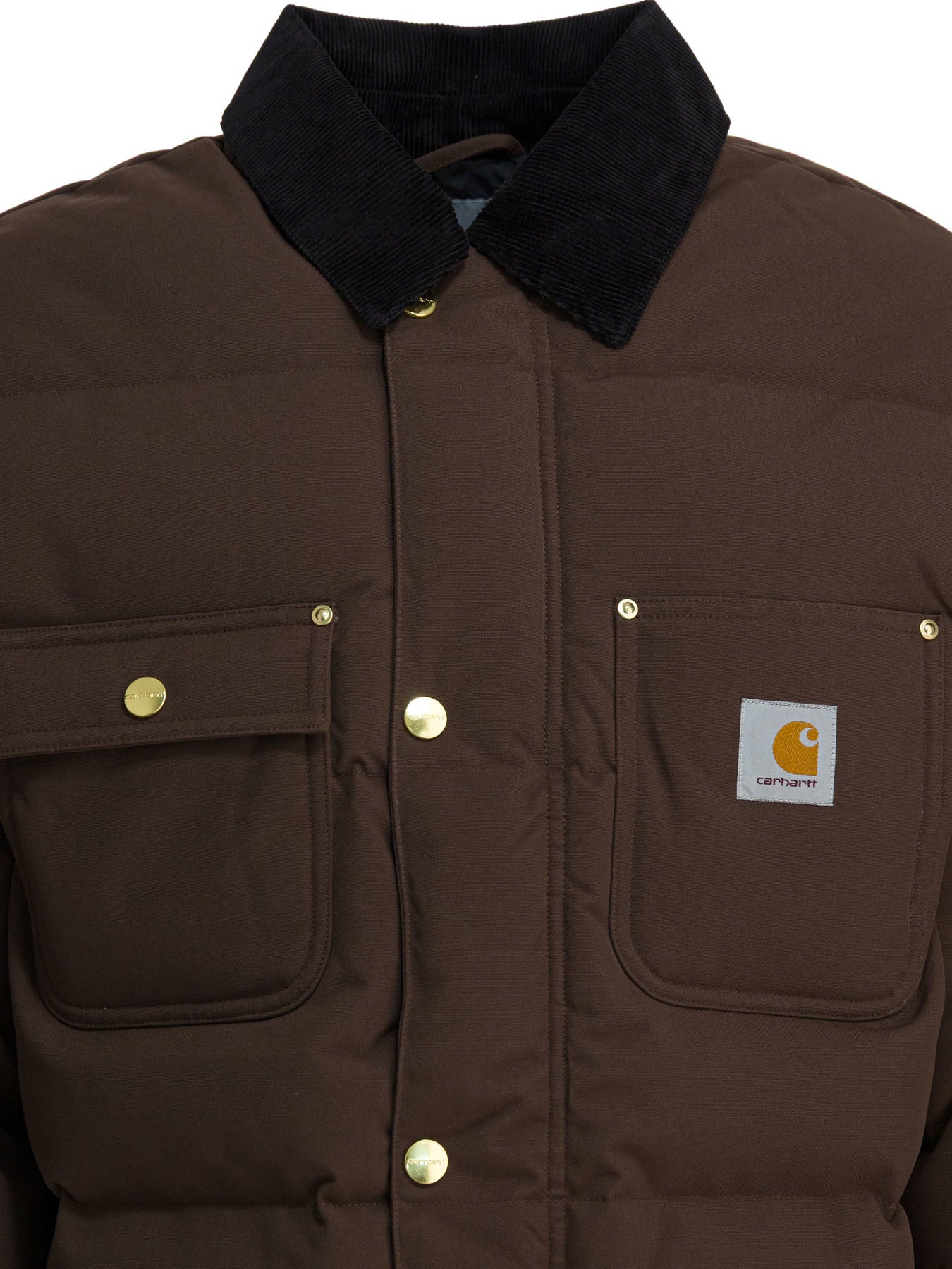 Carhartt WIP nylon "Rayler" down jacket, made of medium-weight nylon canvas with taffeta lining and waterproof treatment. The construction features a regular silhouette, reinforced with ribbed knit inner cuffs and adjustable hem. An adjustable and removable faux fur collar offers functional versatility. Four front pockets with metal detailing and combined front closure with two-way zipper and snap buttons complete the construction. || - Logo and square fabric applique label on the front - Concealed two-way zipper and snap button closure - Removable and adjustable faux fur collar - Inside chest pocket - Four front pockets, one with flap and snap button - Metal rivets in areas of increased wear - Inner taffeta lining - Internal ribbed knit cuffs - Adjustable bottom hem - Regular fit