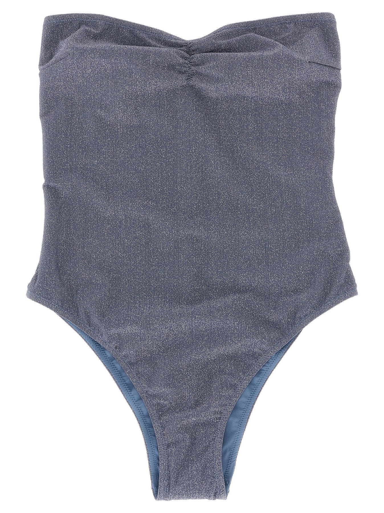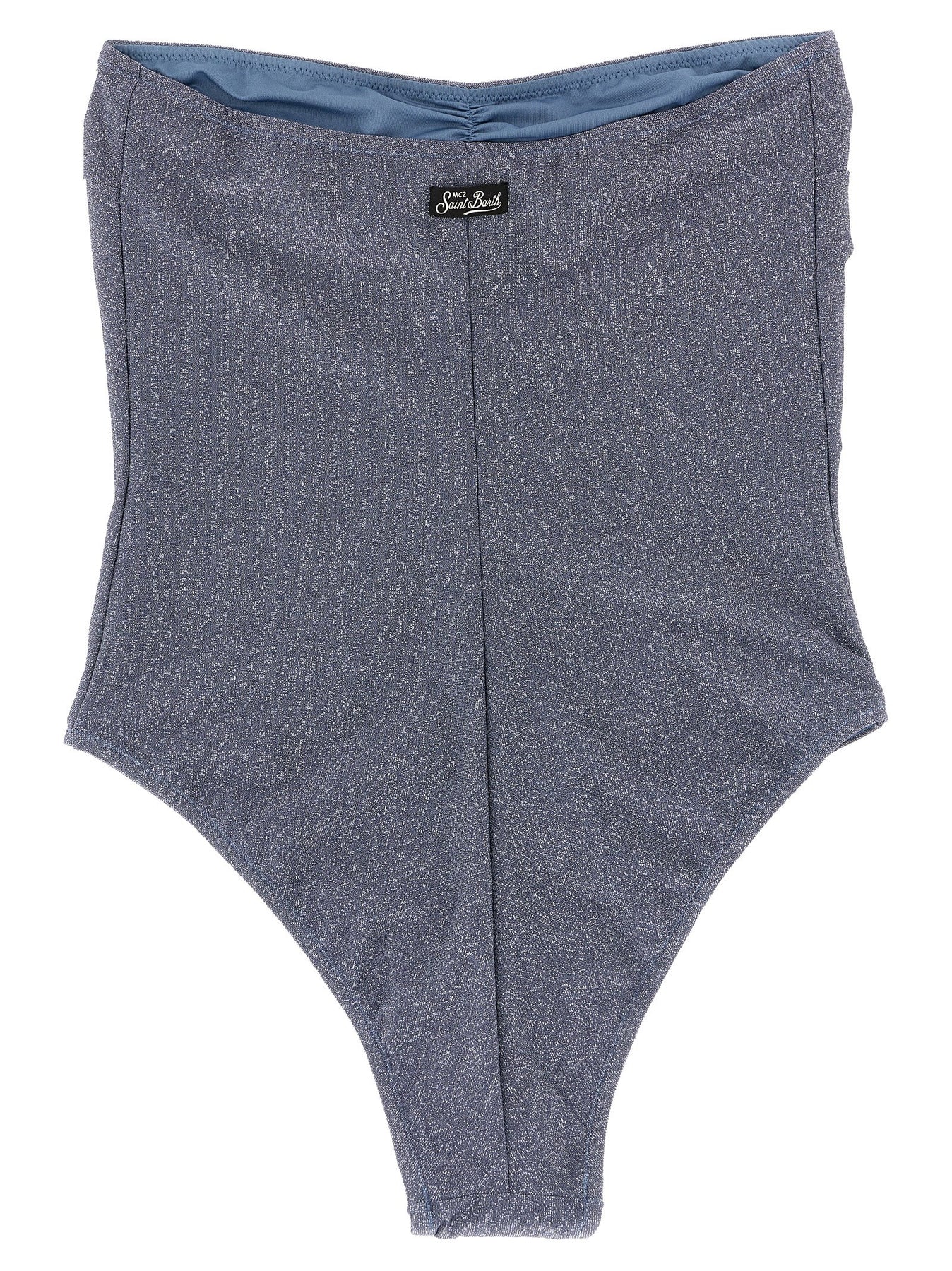 'Soleil' off-the-shoulder lurex fabric one-piece swimsuit, curled heart neckline, back logo patch, classic cover bottoms.