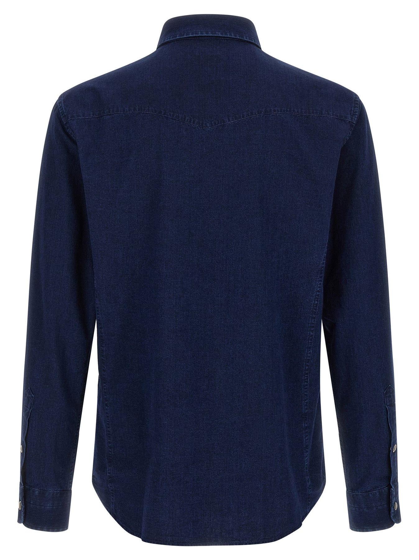 'Western' denim shirt of light cotton poplin with front snap button closure, pockets, long cuffed sleeves.