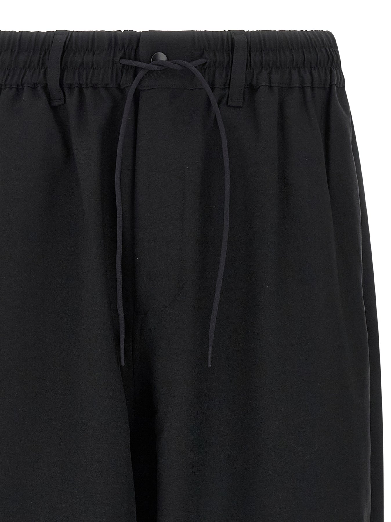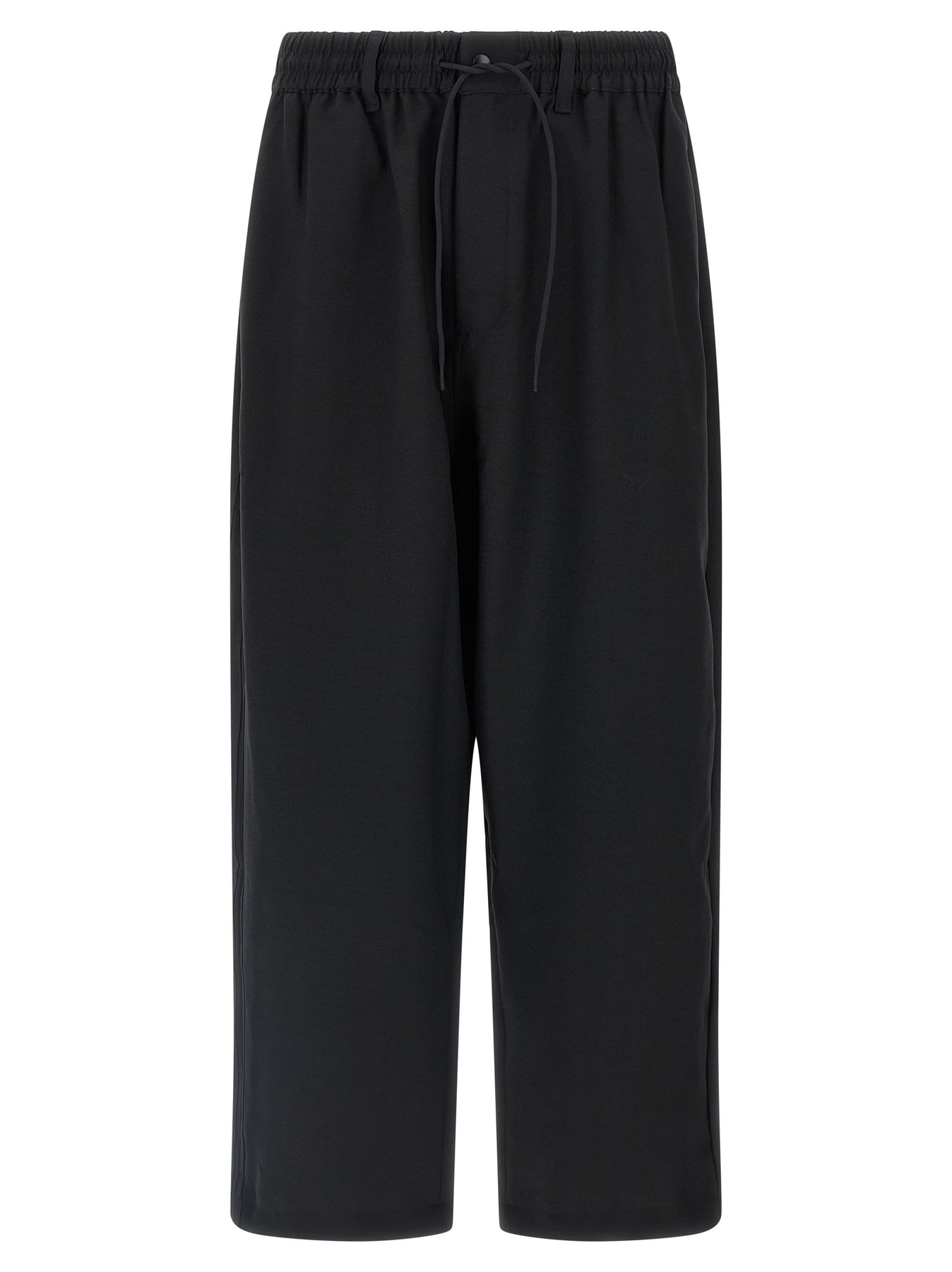 'Y-3 Sport Uniform' synthetic fabric trousers, tone-on-tone satin side bands, front zip and snap button closure, adjustable drawstring elastic at the waist, low crotch, pockets, wide leg, cotton lining, drawstring at the hem.