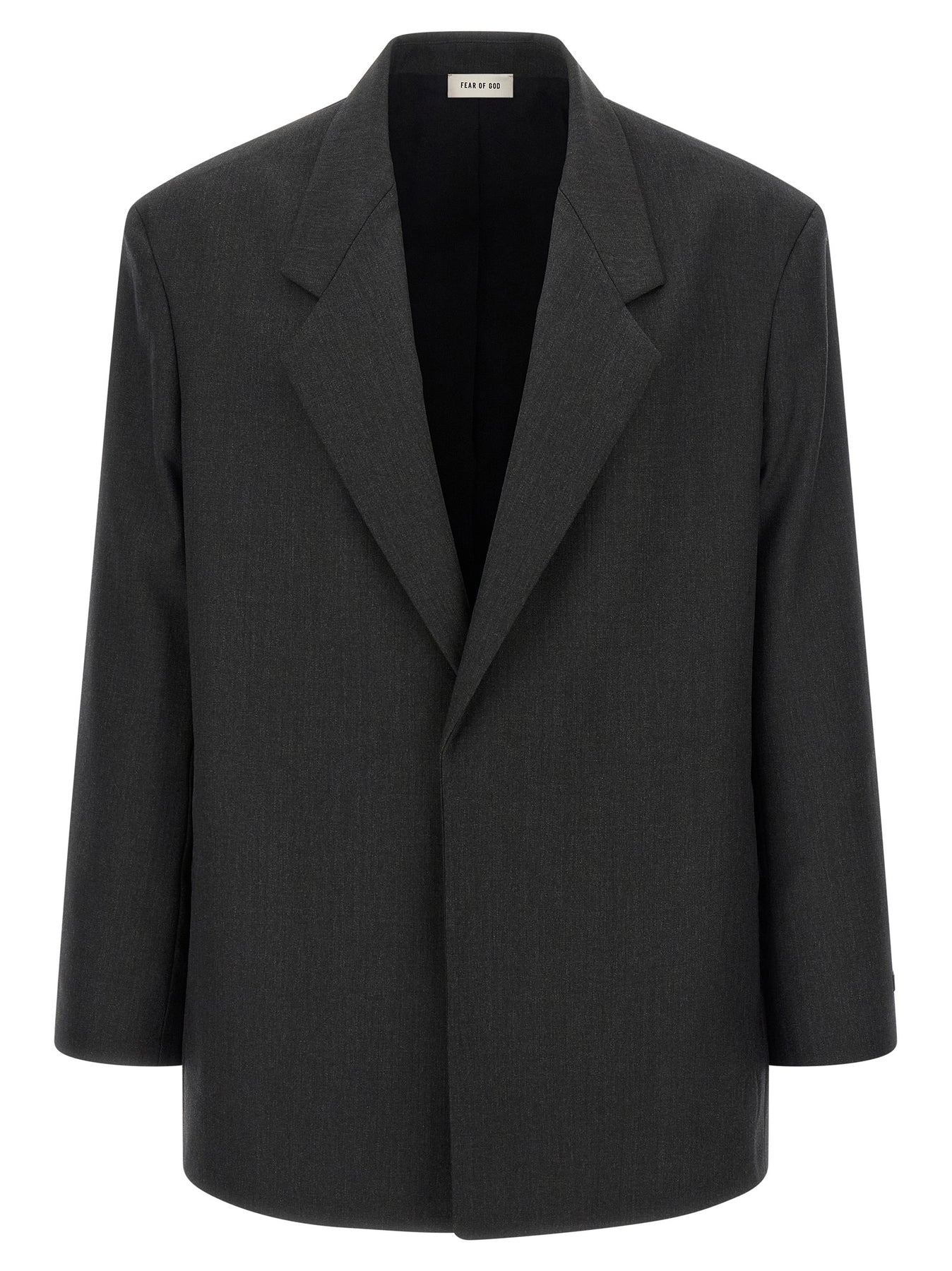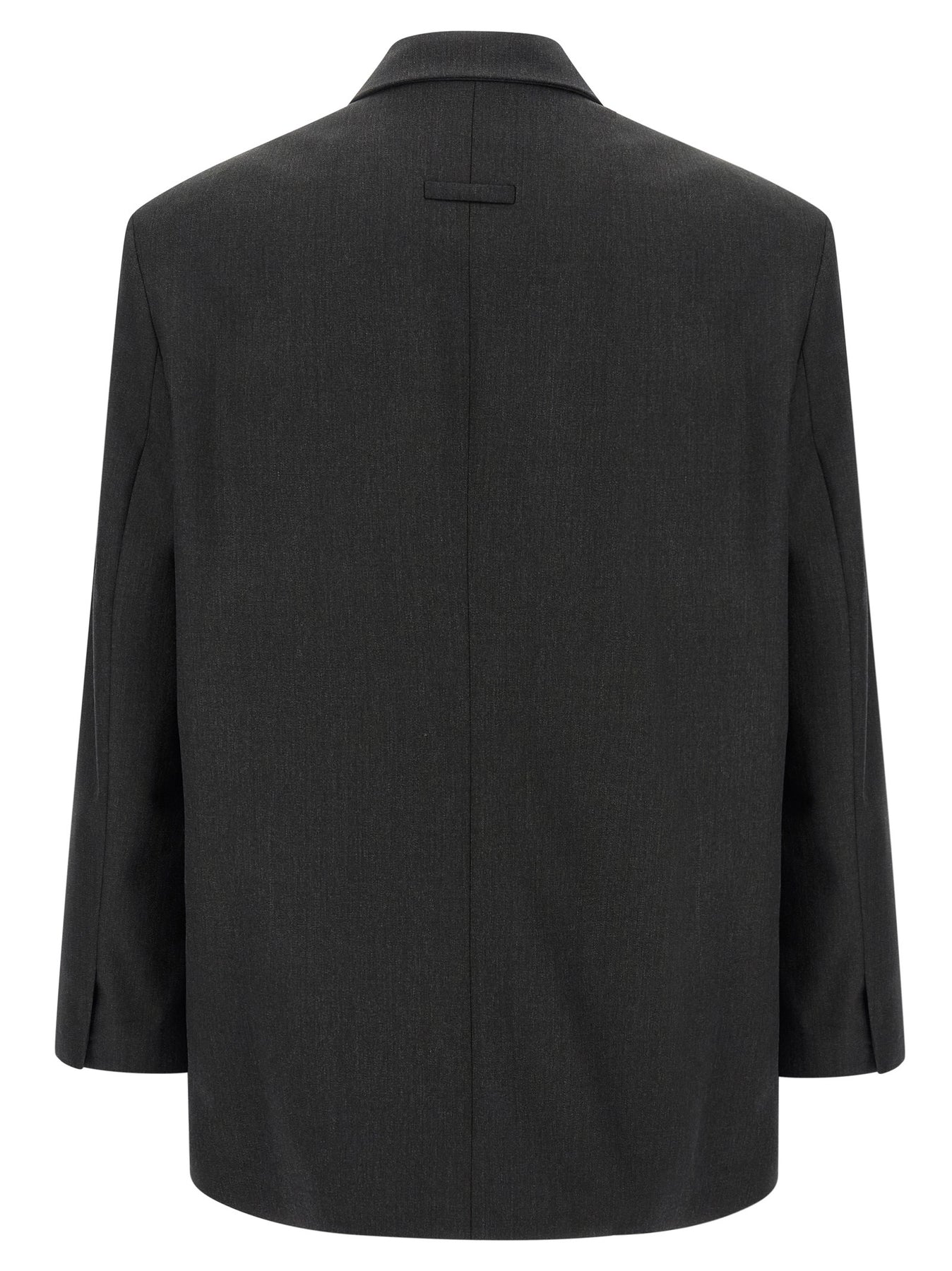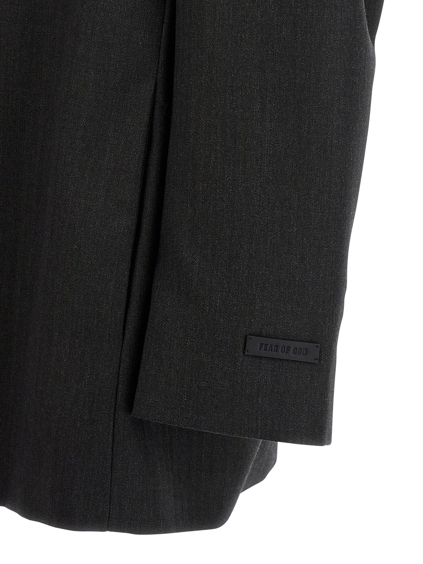 Herringbone wool single-breasted blazer with front button closure, mirror lapels, pockets, padded shoulder strap, leather cuffs and logo patch, cupro lining.