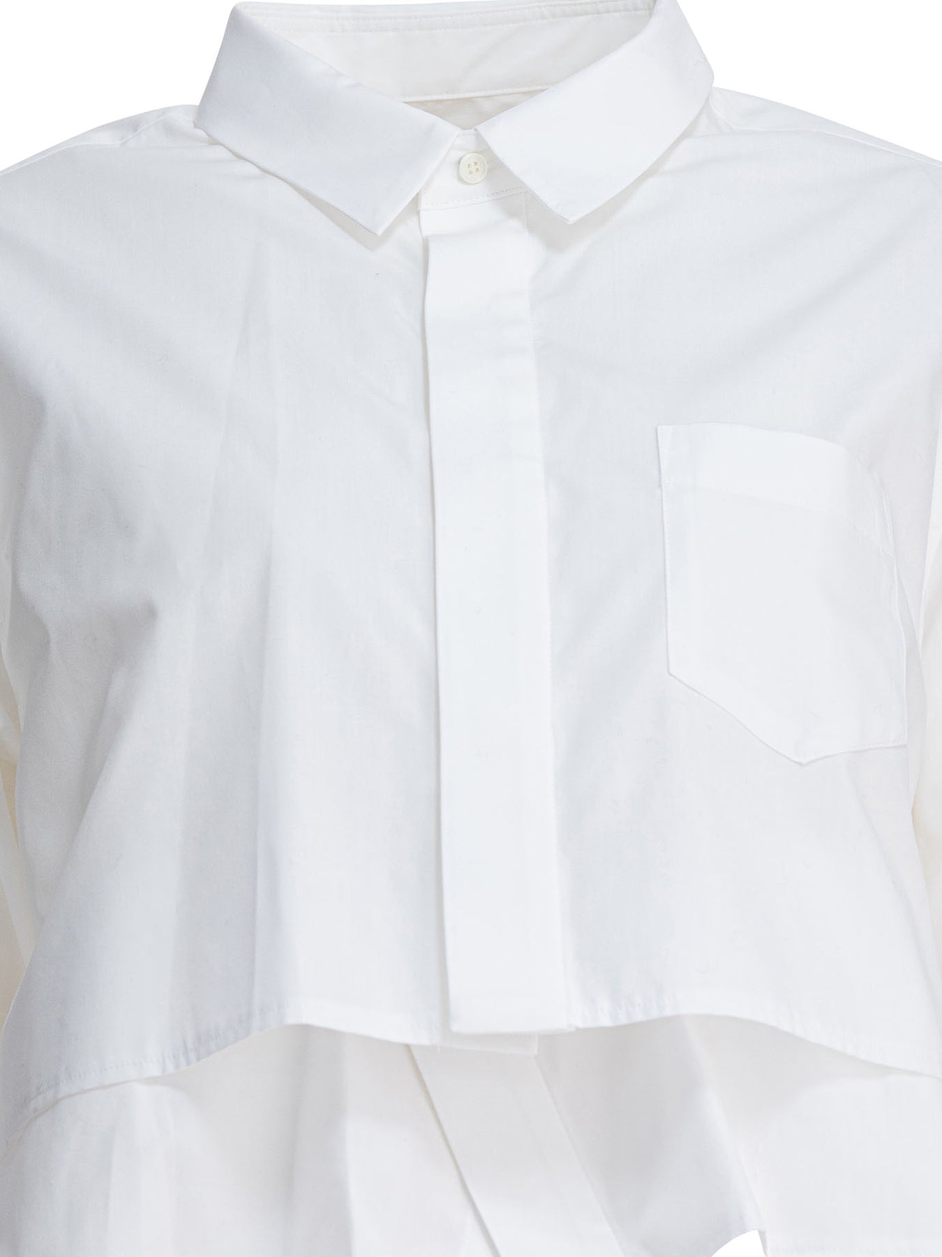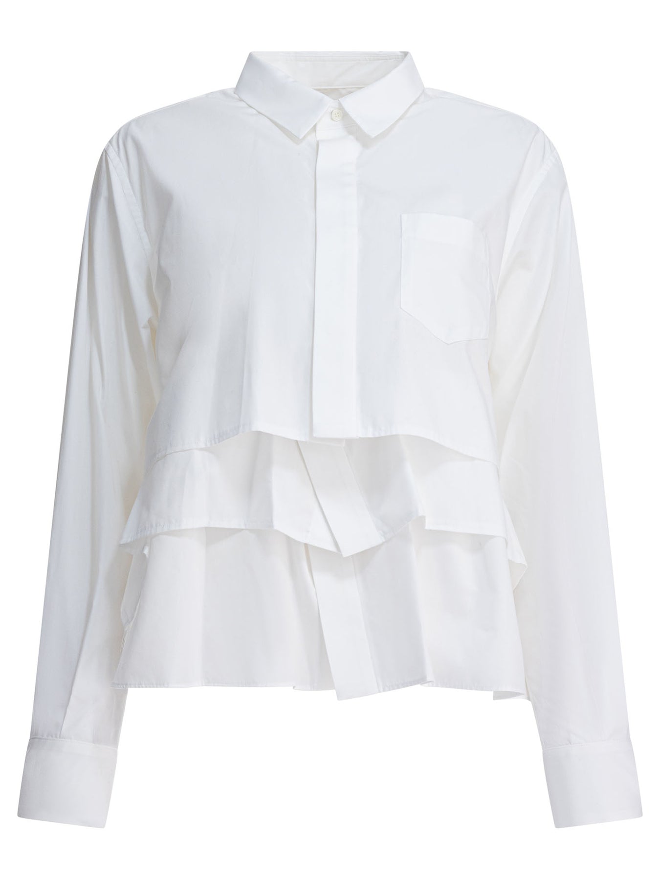 Sacai cotton popline shirt made from cotton fabric with a smooth surface. The design features a straight construction with a structured silhouette and details such as an applique breast pocket and integrated ruffles on the body of the garment. The button closure is concealed, contributing to a clean look. The classic collar and long sleeves complete the essential structure of the product. || - Solid color - Classic collar - Long sleeves - Patch pocket on the chest - Integrated ruffles - Concealed button closure - Regular fit