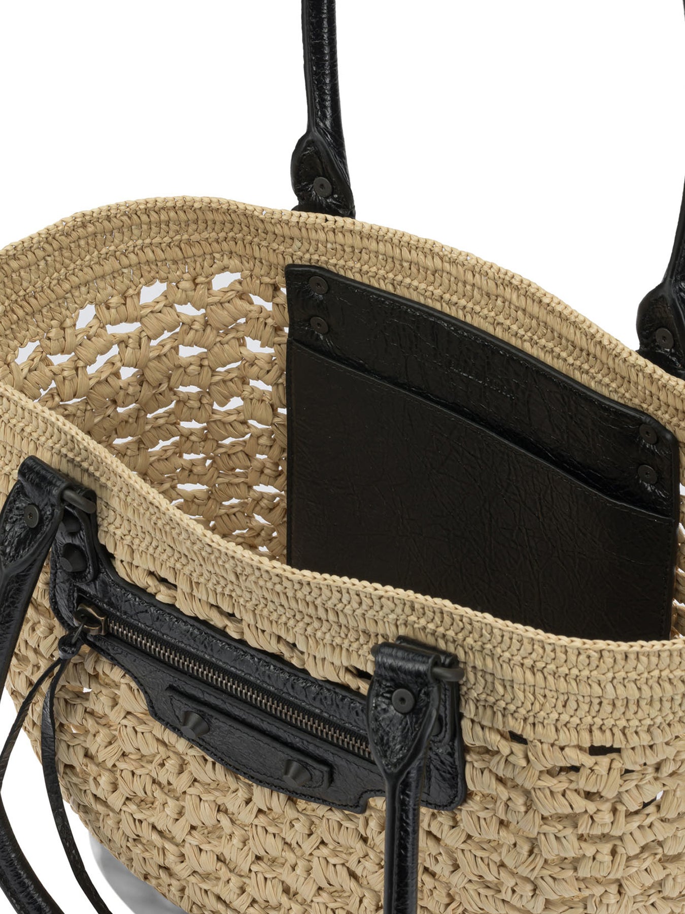 Balenciaga medium "Le City Basket" shoulder bag made of raffia-effect fabric and Arena lambskin leather. The basket-like structure features two leather handles for shoulder or hand carry. The top opening provides direct access to a main compartment. A decorative zipper with knotted leather pulls defines the front panel, while brass hardware characterizes the metal details. || - Arena raffia-effect fabric and lambskin exterior - Two leather handles - Handle light: 22 cm - Decorative front zipper with knotted leather puller - Top opening without closures - Interior main compartment - Interior flat pocket with embossed Balenciaga logo - Can hold smartphone, tablet, book and wallet - Brass hardware - Environmentally sustainable product