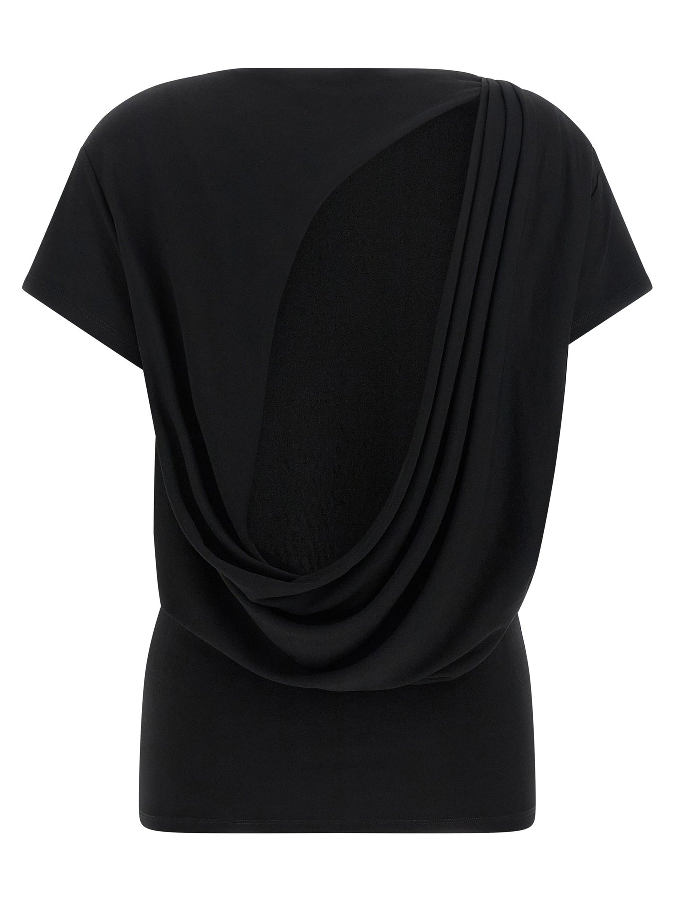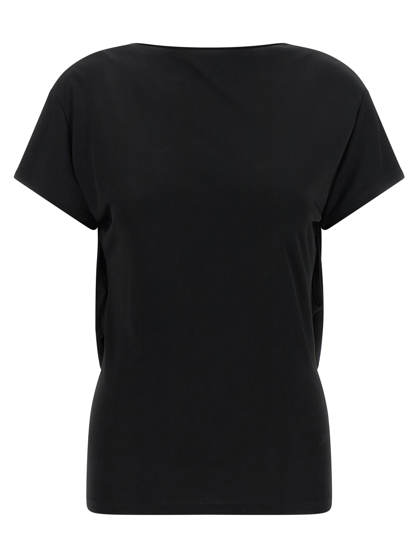 'Le Haut Mistral' fluid viscose jersey t-shirt, tone-on-tone logo embroidery at the front, boat neck, wide cut-out and back draping, and short sleeves.