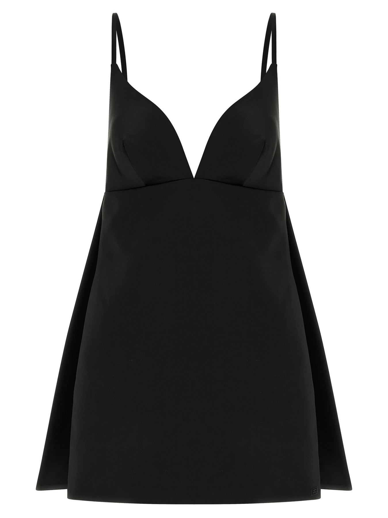 Duchesse mini dress with back cape construction, wide front V-neck, thin adjustable straps, sleeveless, wide back neckline, side zip closure, monogram satin lining.