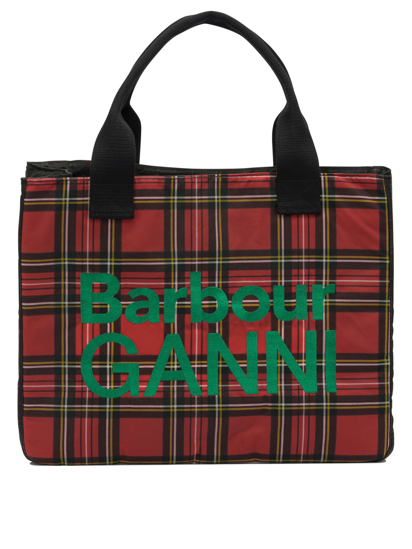 Barbour x GANNI Barbour handbag made of waxed technical fabric with a textured surface. The construction features an essential, semi-rigid silhouette with double grosgrain fabric handles for a solid grip. The bag features a large main compartment lined internally in contrasting tartan fabric and includes an interior zippered pocket. The front is appliquéd with an embroidered Barbour Ganni logo. || - Textured finish waxed technical fabric - Barbour tartan pattern outside, dark tartan lining inside - Double grosgrain handles - Large main compartment - Inside pocket with zipper closure - Semi-rigid structure - Barbour Ganni logo embroidered on the front - Environmentally sustainable product - Product of the Barbour x GANNI collaboration