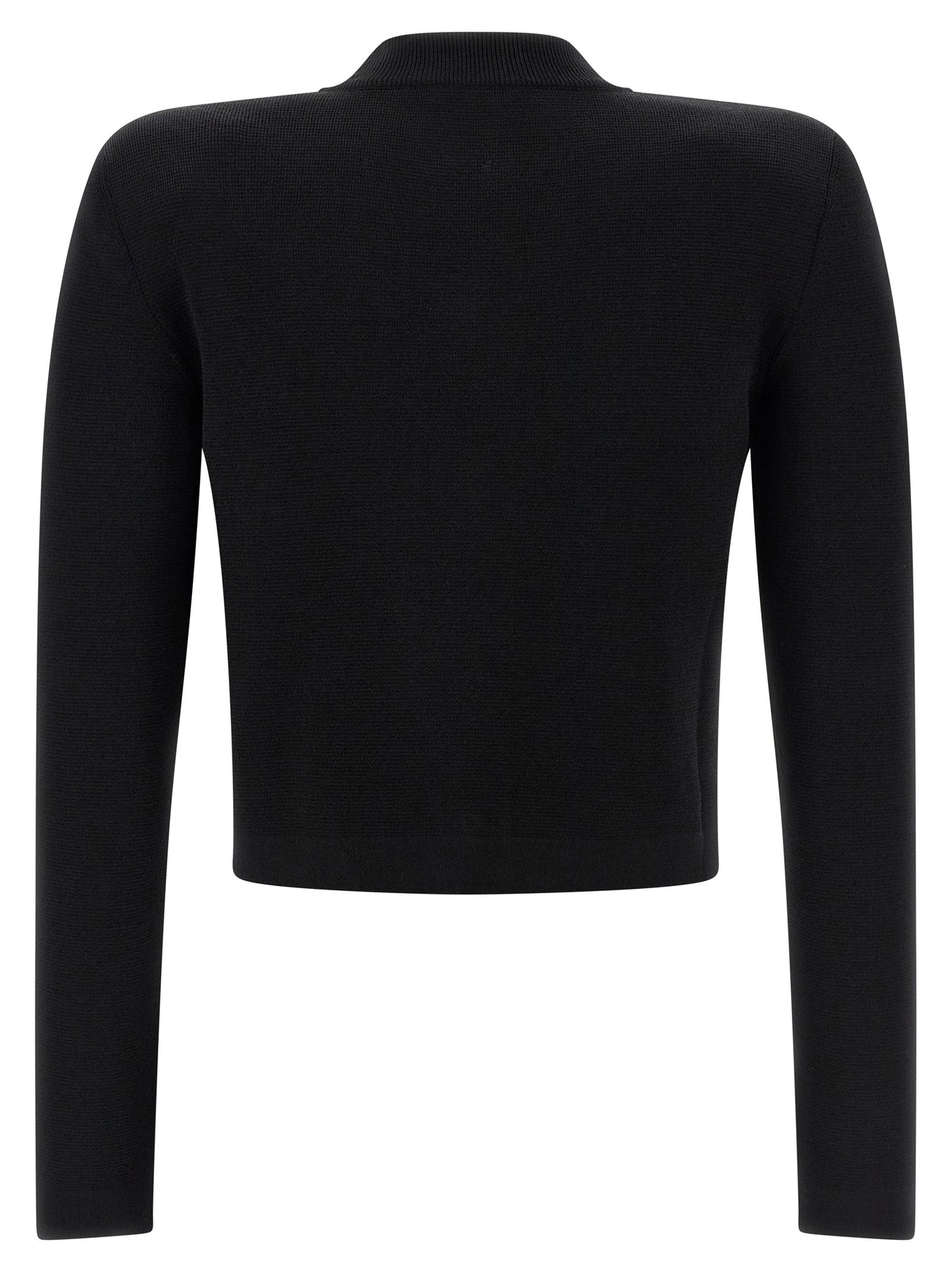 Viscose knit cardigan, crew neck, padded shoulders, front 'Testa di Leone' button detail, long sleeves.