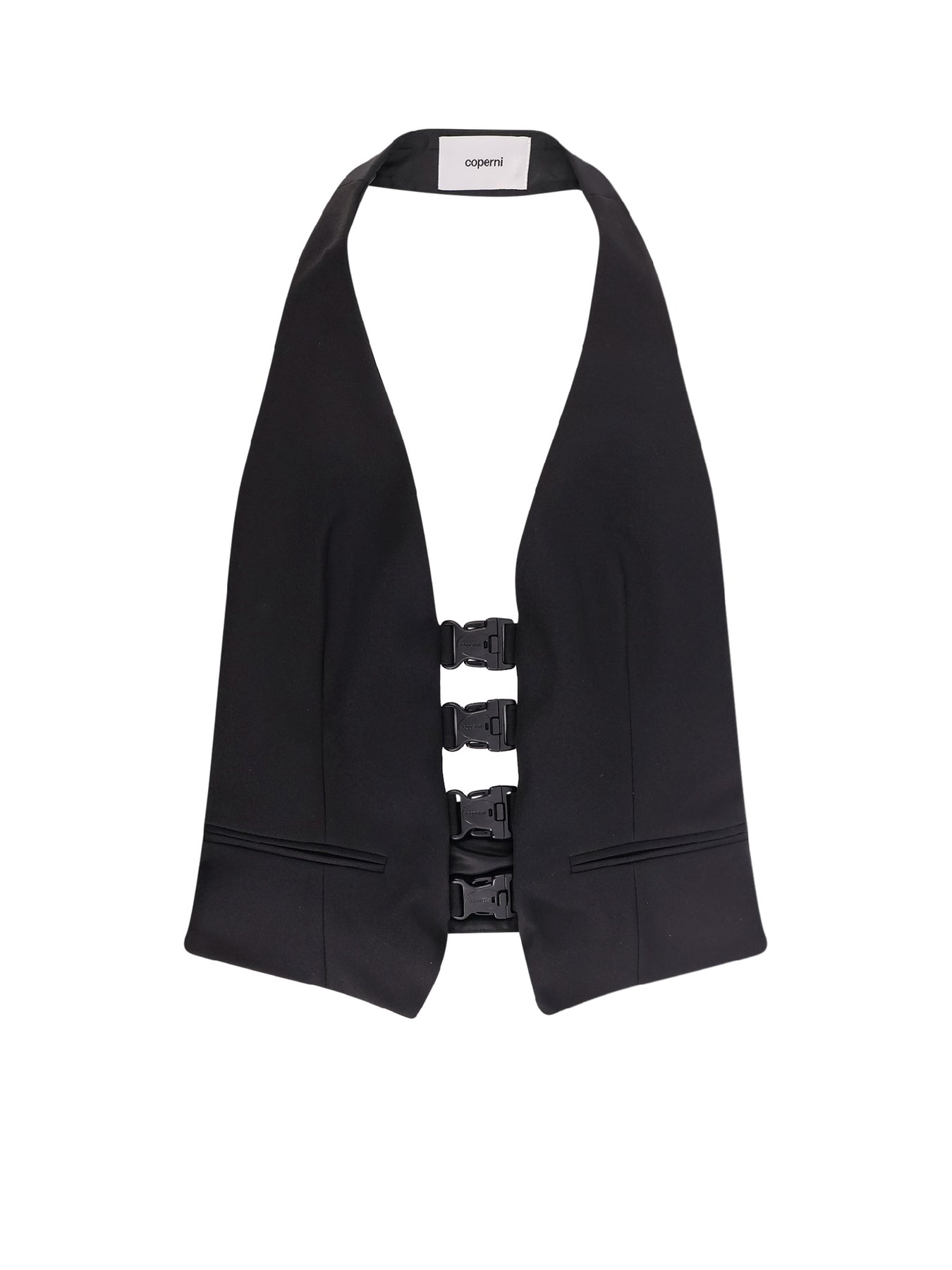 Iconic logoed four buckles on the front Strap on the neck Two welt pockets on the front One logoed buckle on the back 100% recycled polyester Lining: 52% acetate, 48% viscose SKU: COPT35F3004BLK