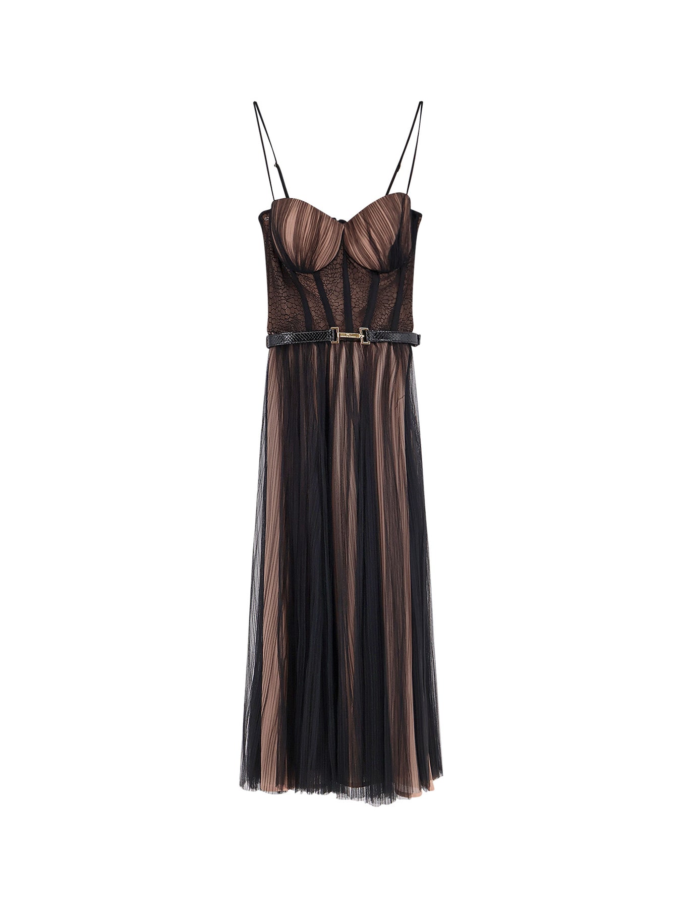 Adjustable thin shoulder straps and back zip closure Bustier corsage with padded bra Removable waist belt and contrasting lining 100% polyamide Lining: 100% polyester SKU: AB88957E2110