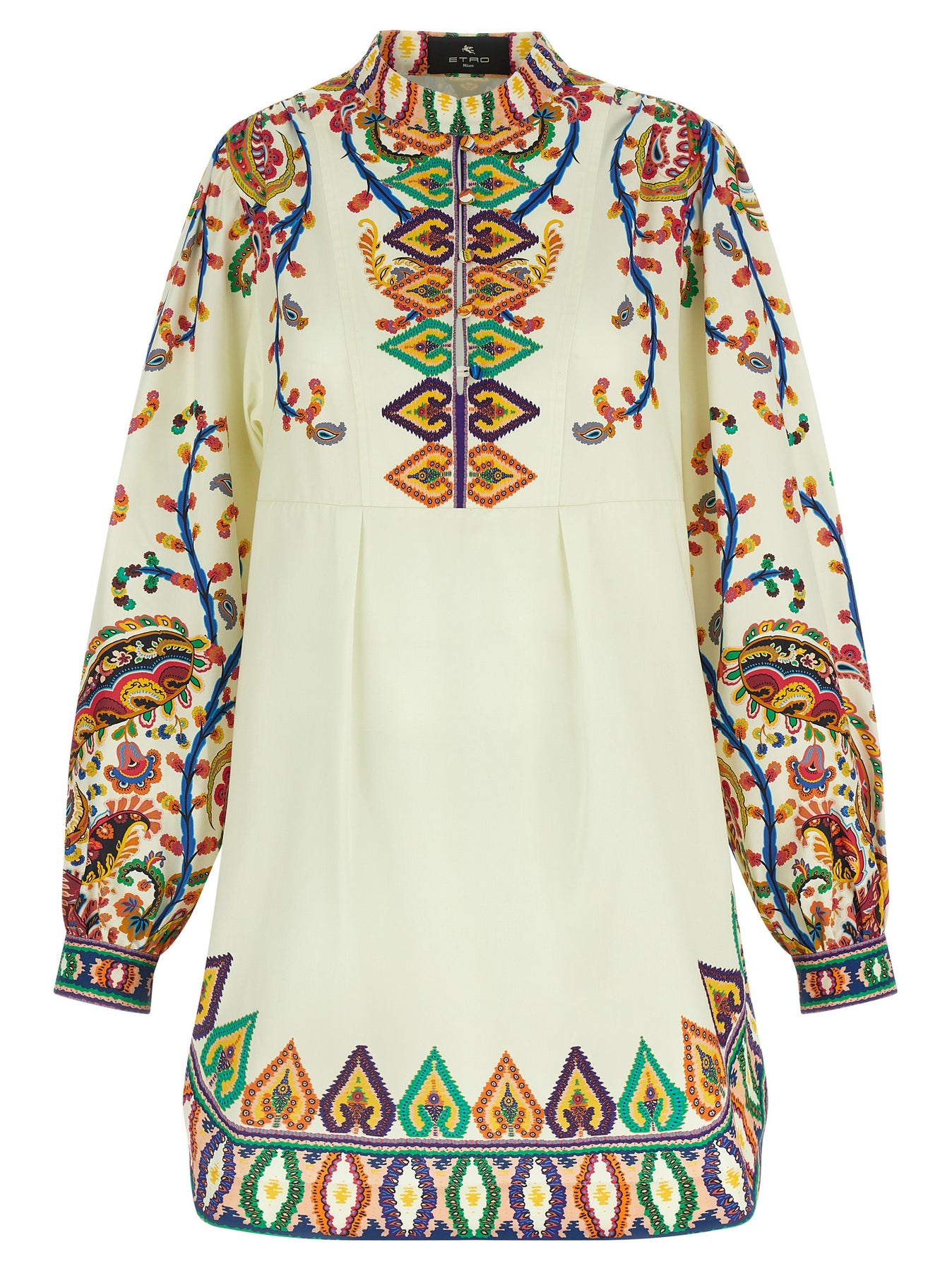 Cotton poplin mini dress with Paisley print placed, mandarin collar, front closure with covered buttons, side pockets, round hem, long wide sleeves on the slightly curled hem with button-opening cuffs.