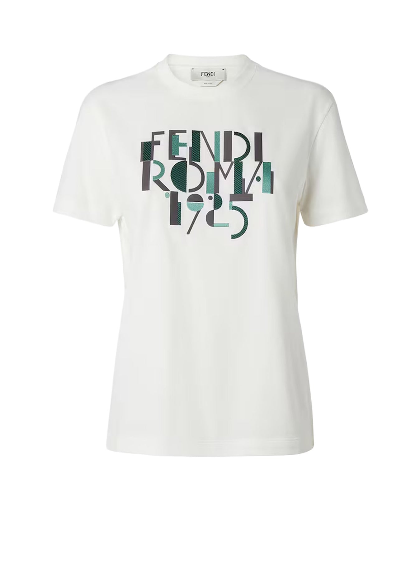 Ribbed crewneck and short sleeves Fendi Roma logo embroidery on the front Regular fit Made in Italy 100% cotton SKU: FS7254AVF9F08QQ