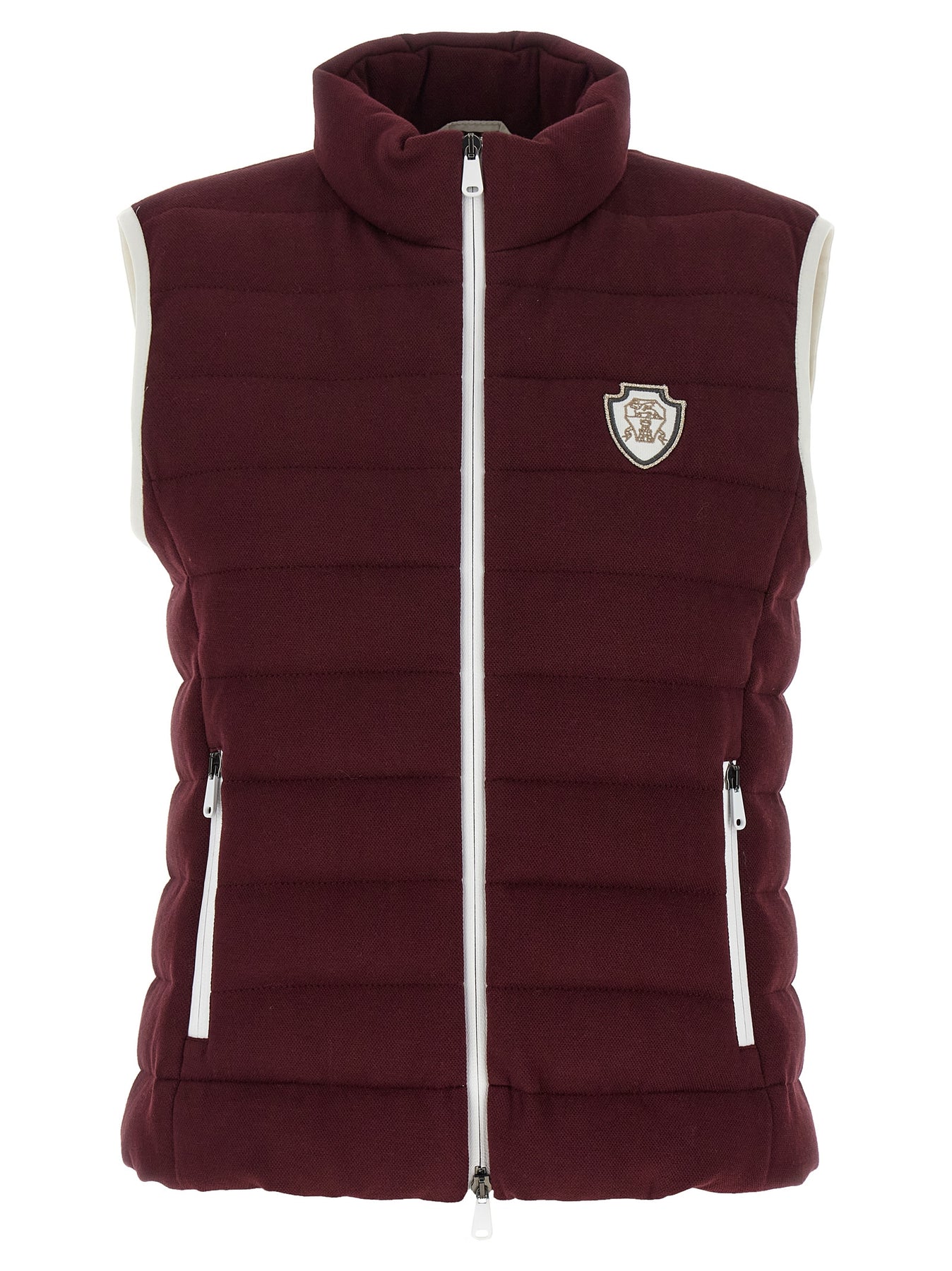 Piqué cotton vest lightly padded with goose down with contrast details, front logo patch, pockets, front zip closure, high neck.