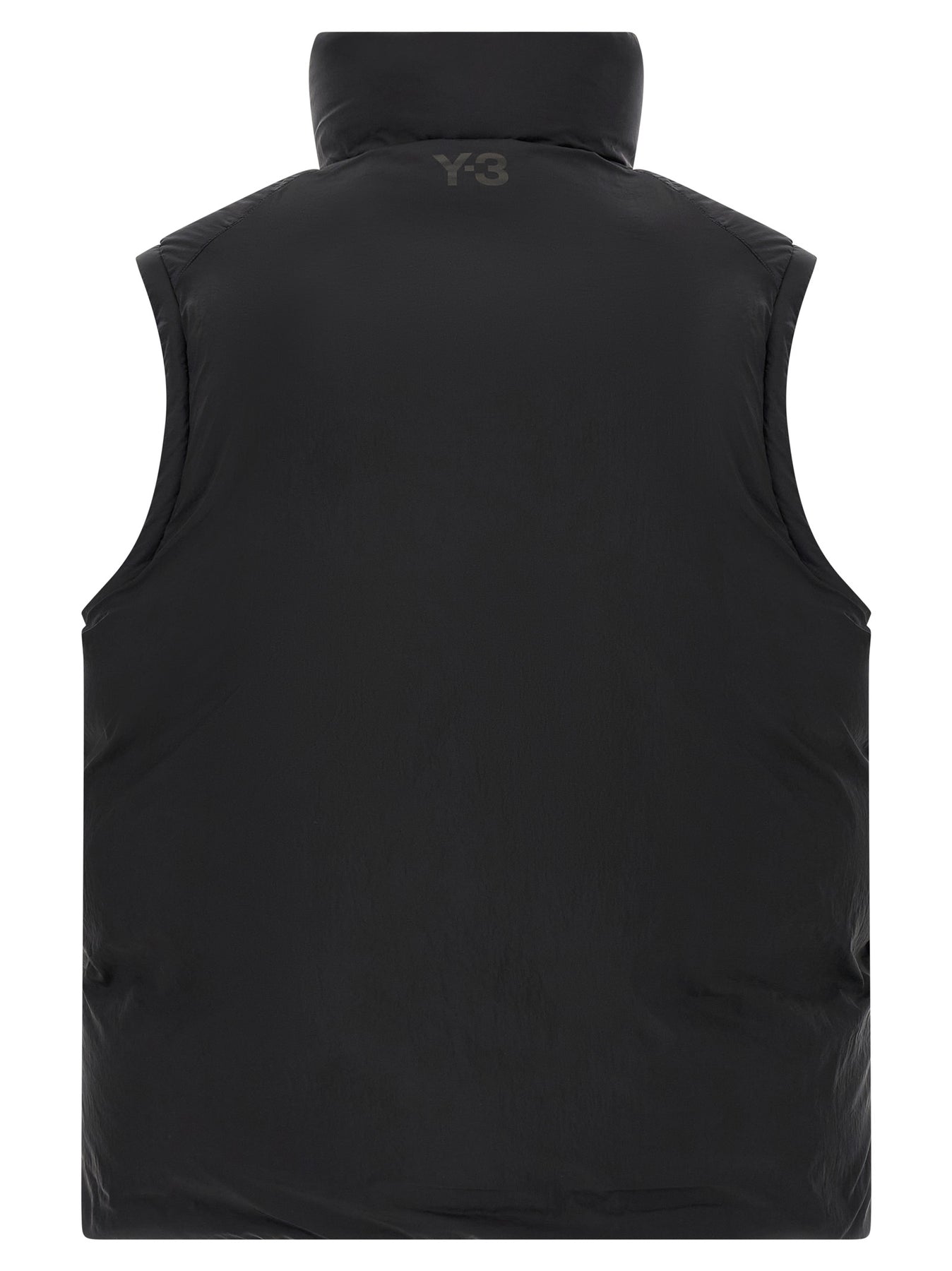 'Y-3 Puffer' smooth nylon vest padded with duck down and PrimaLoft®, standing collar, tonal oil printed logo on the back, front zip closure, pockets, drawstring at the hem. SUSTAINABLE: This product is made with recycled nylon.