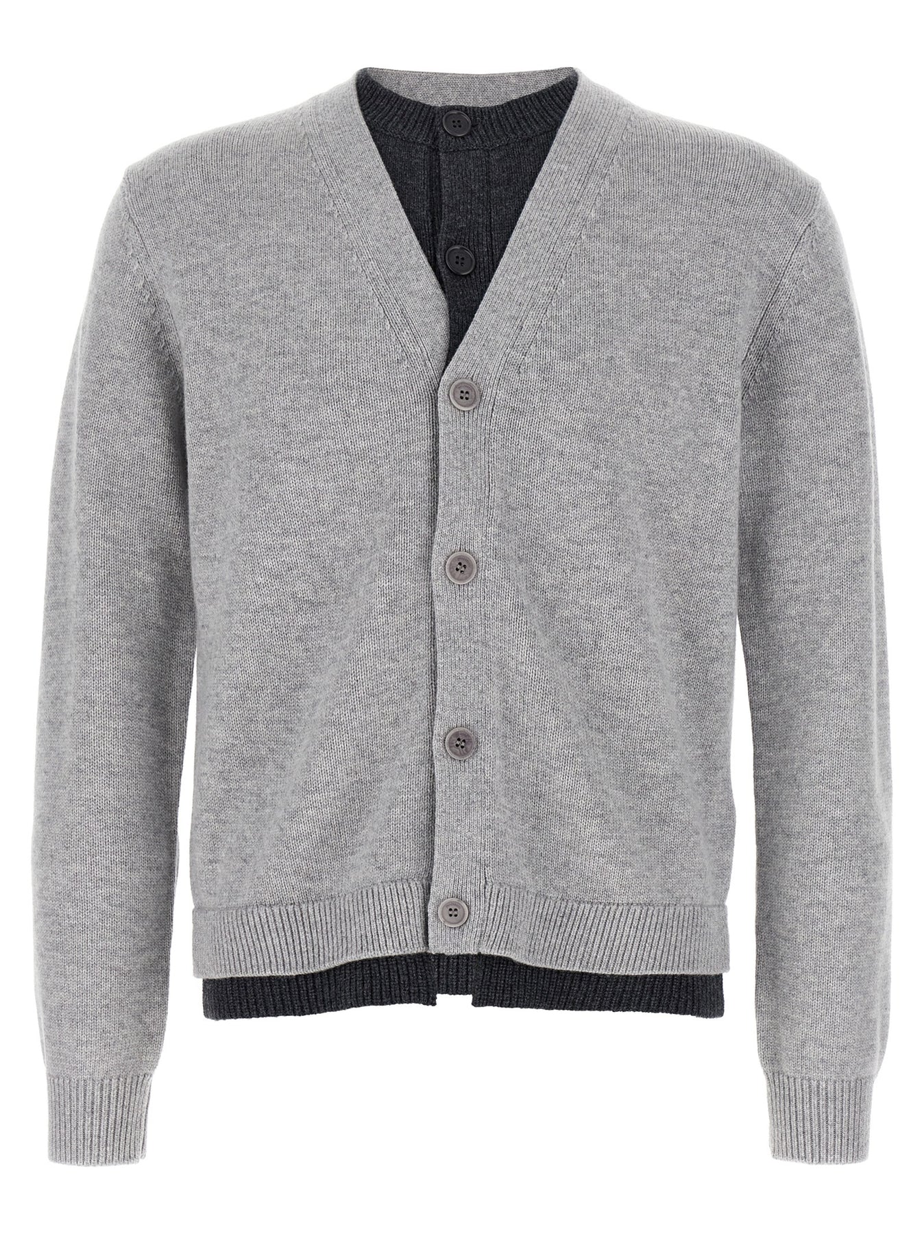 'Contrast Layered' wool and cashmere blend cardigan, consisting of two contrasting layers, the lower one with round neckline and button closure, the upper one with V-neck, button closure and long cuffed sleeves, asymmetrical hem.