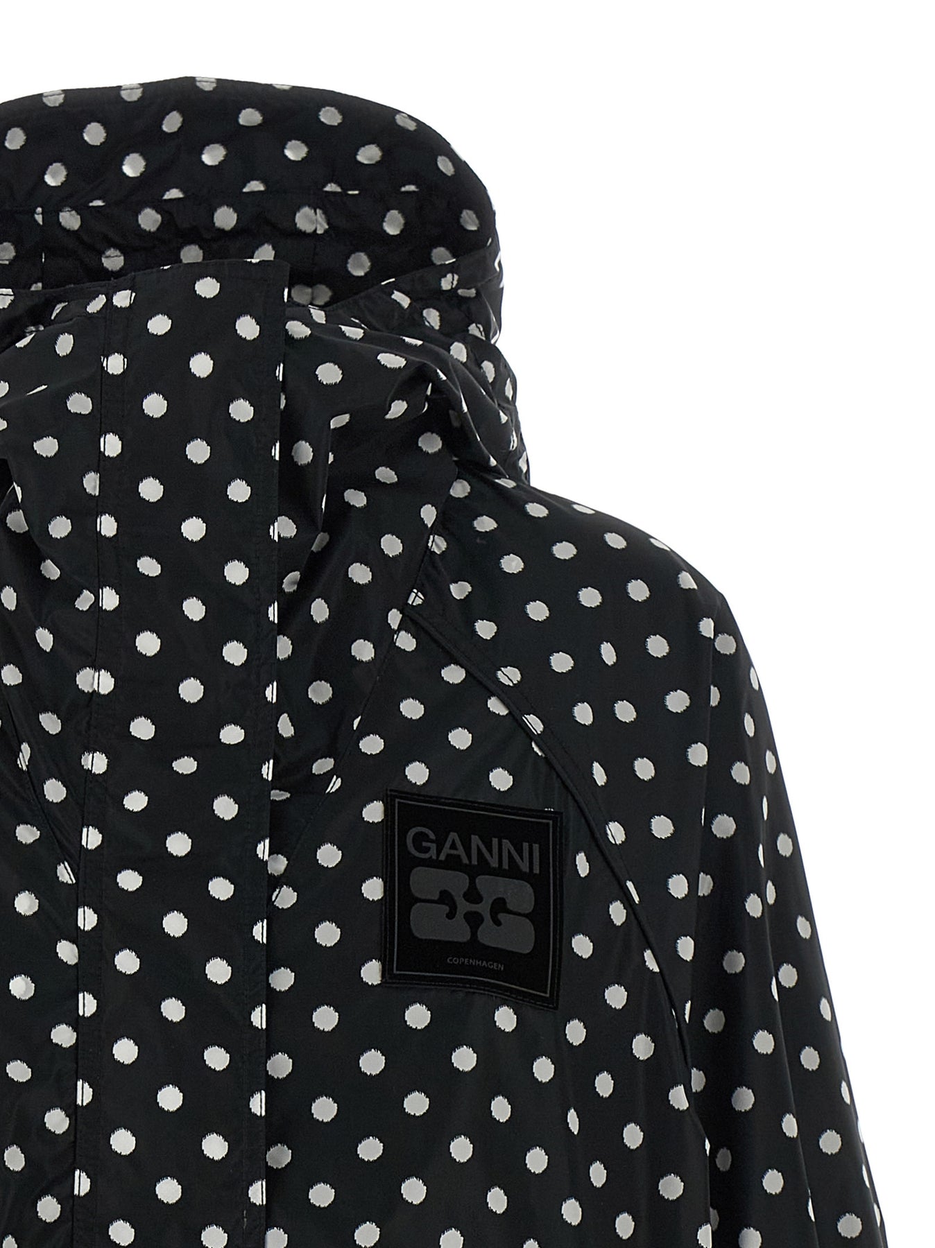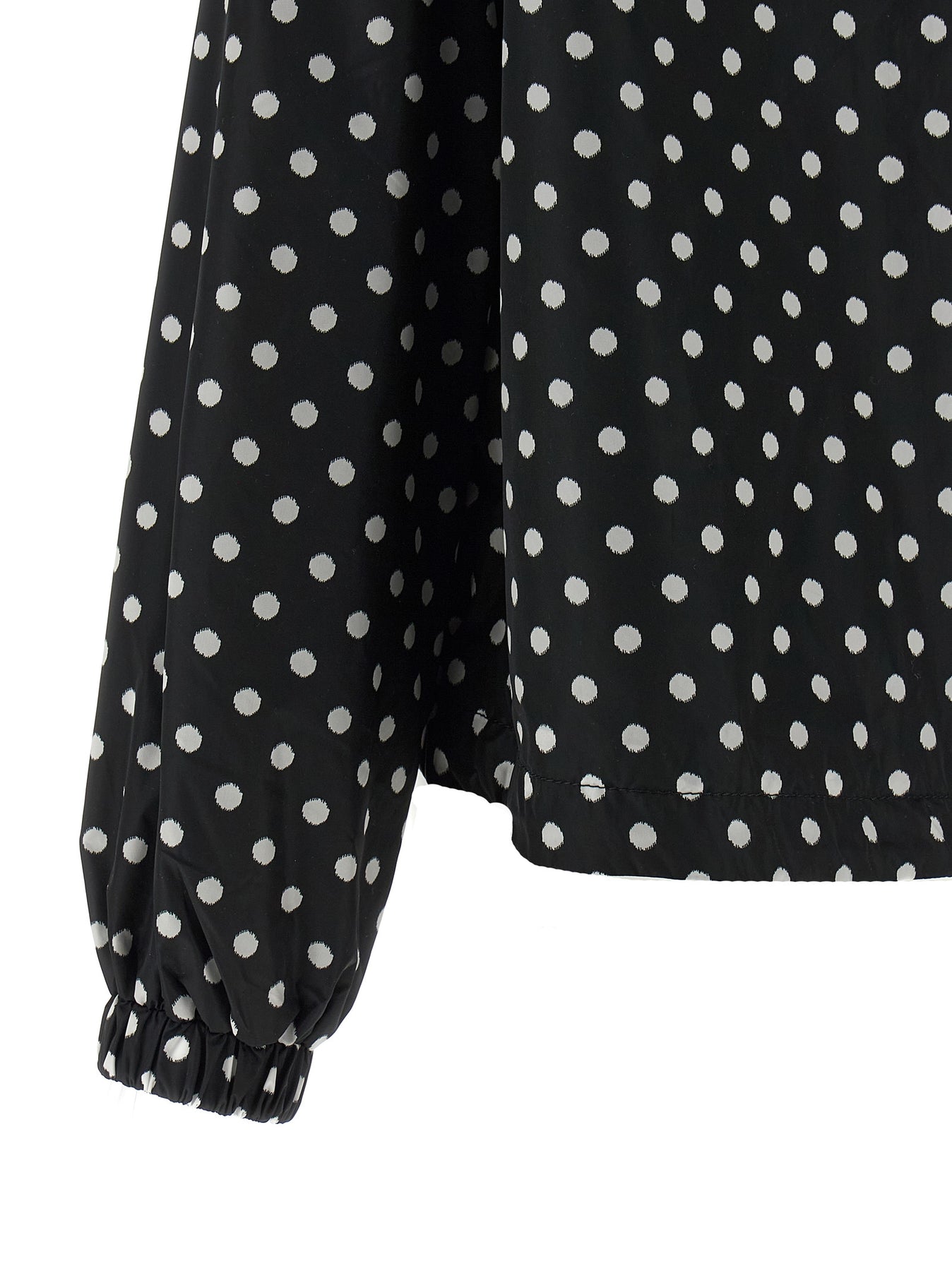 Nylon windbreaker jacket with all-over polka dot print, hood, silicone logo patch and zip closure and front snap buttons, pockets, long sleeves with elastic cuffs, drawstring on the hem, solid nylon lining. SUSTAINABLE: Product made with recycled polyamide.