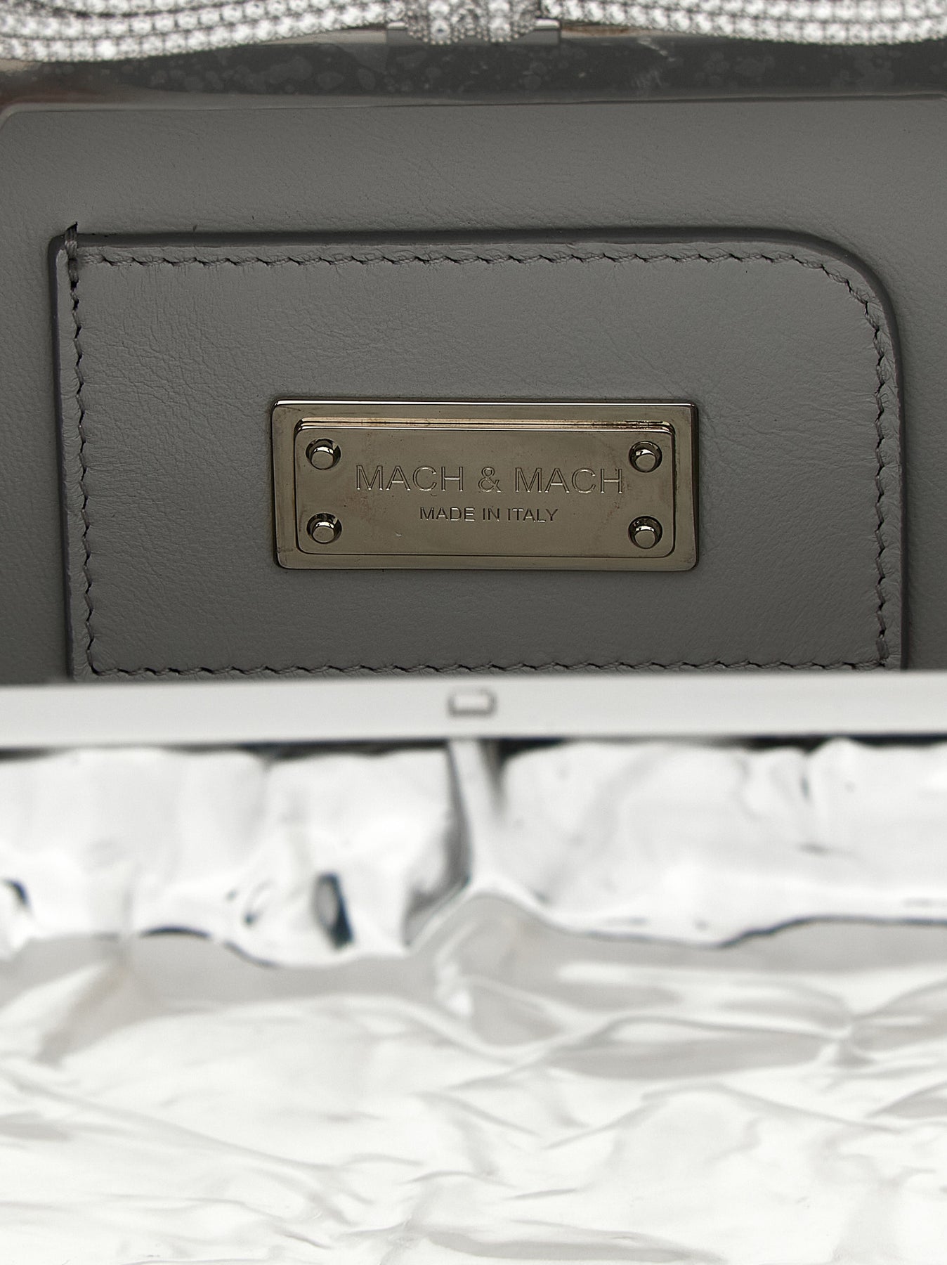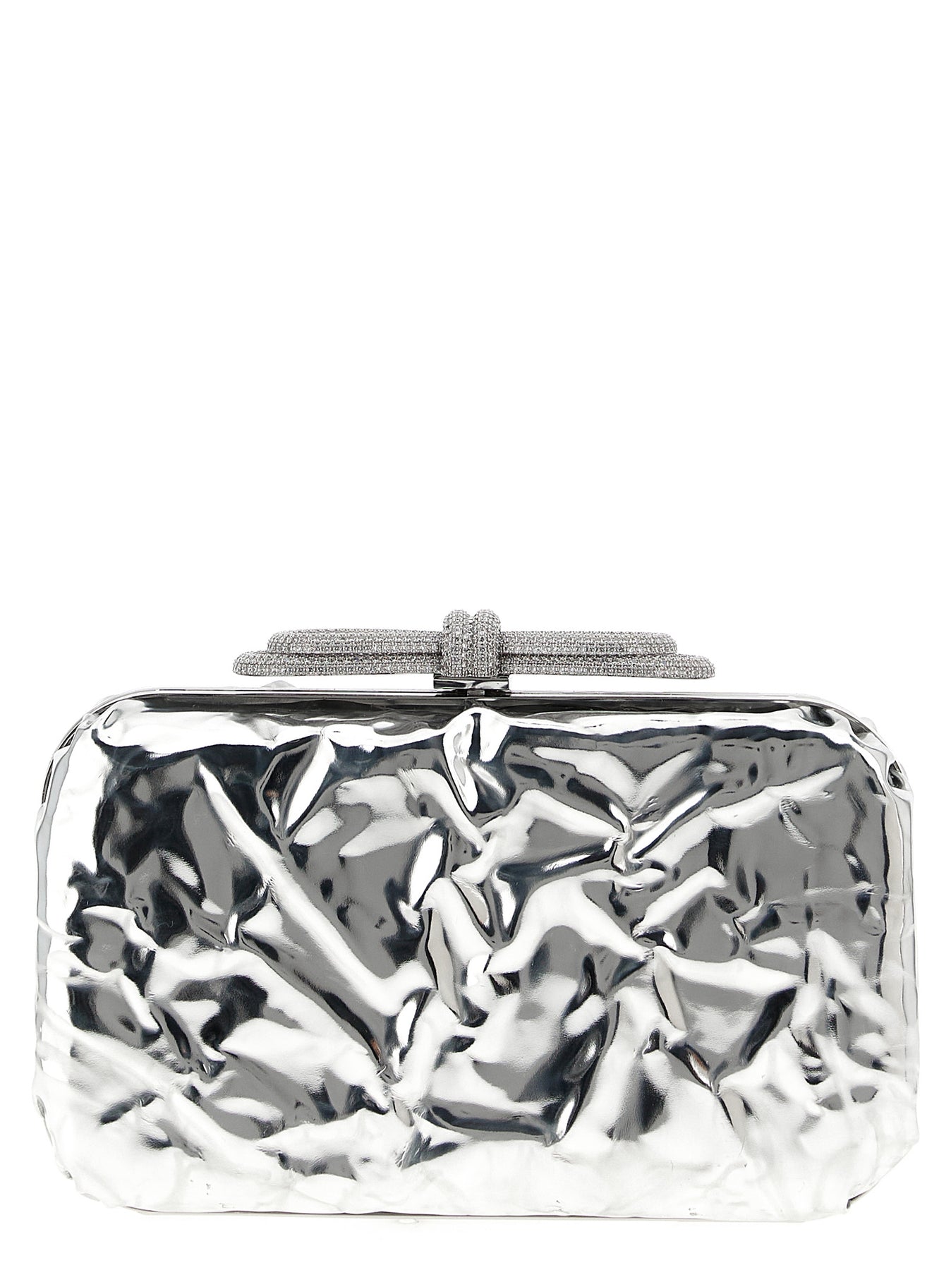 Clutch 'Double Bow Wrapped Mirror' in wrinkled-effect laminated leather, metal closure with jewel bow application, removable chain shoulder strap.