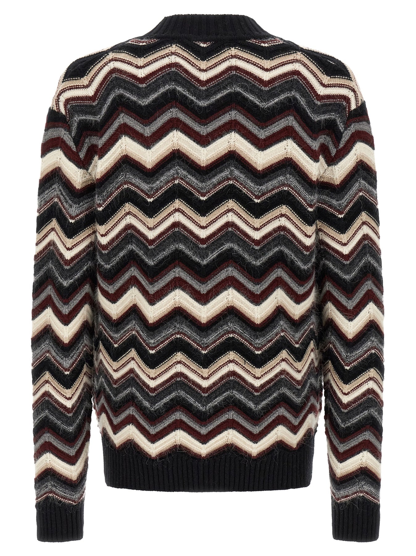 Zigzag pattern wool and alpaca blend cardigan with solid color ribbed piping, V-neck, front button closure, pockets, long cuffed sleeves.