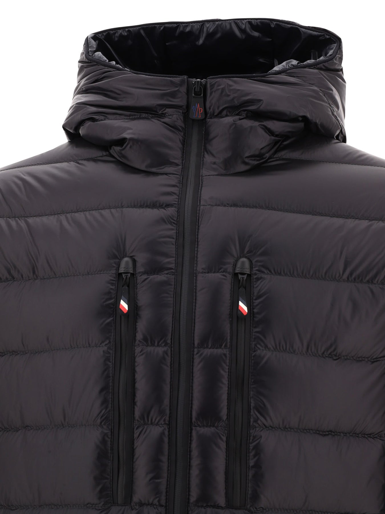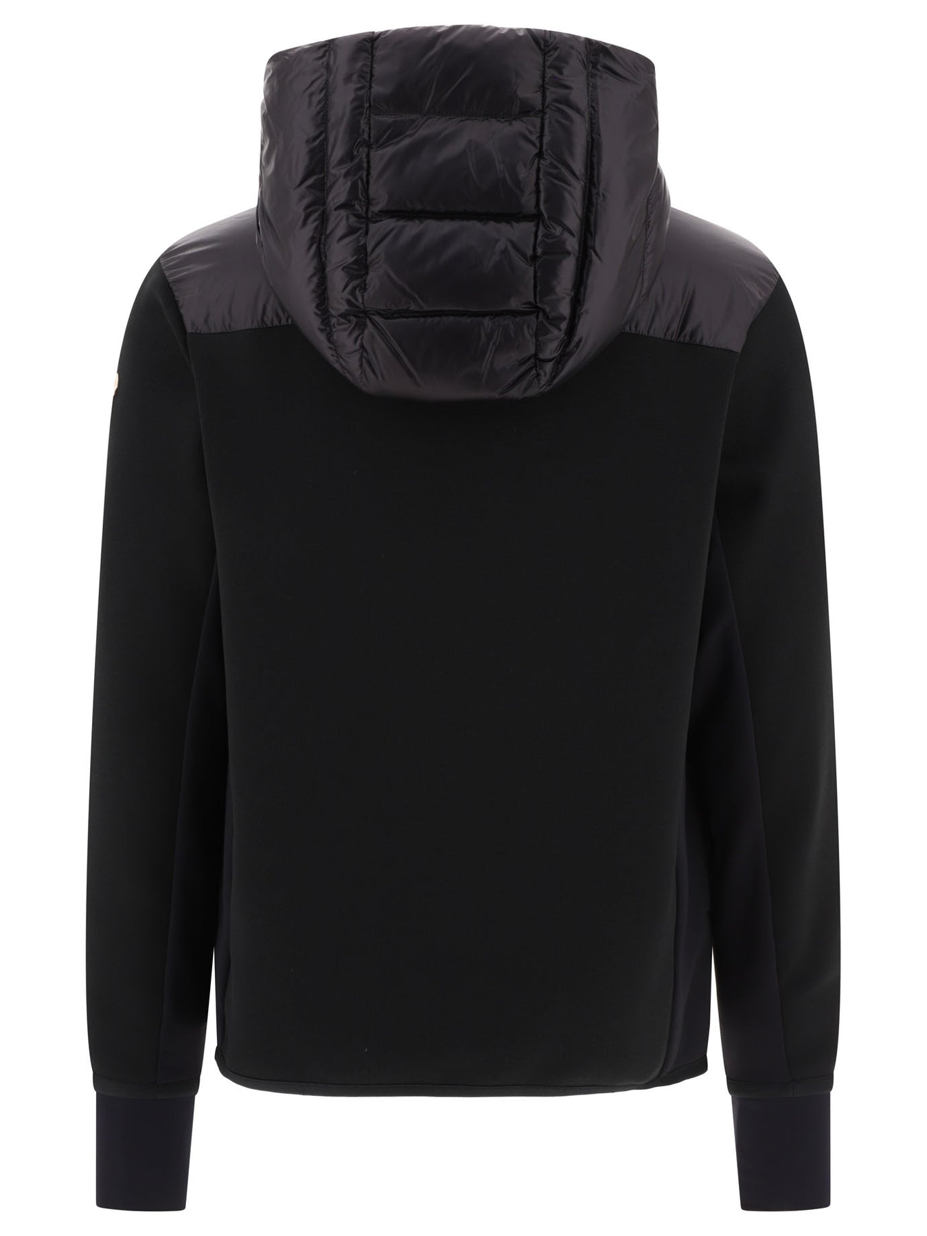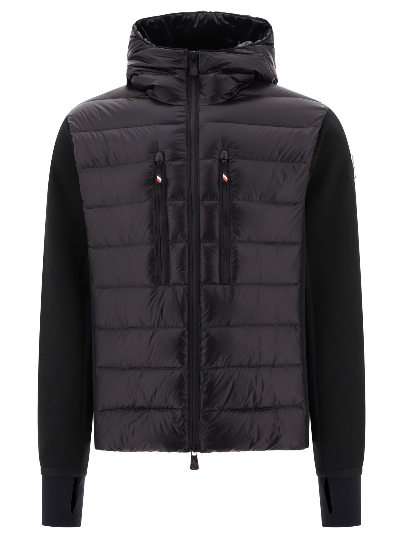 Moncler Grenoble padded hoodie made of vanisé polyester, with nylon panels on front, back and hood. The construction features down padding distributed on the torso, back and hood; the inner lining is micro ripstop. Construction features a streamlined silhouette and front closure via Water Repellent Look zipper. Cuffs fitted with stretch jersey gaiters and water-repellent zippered chest pockets contribute to functionality. || - Applied logo - Long sleeves - Padded hood with nylon panel - Micro ripstop lining - Down padding on front, back and hood - Water Repellent zippered front closure - Chest pockets with Water Repellent zipper - Wrists with stretch jersey gaiters - Regular fit