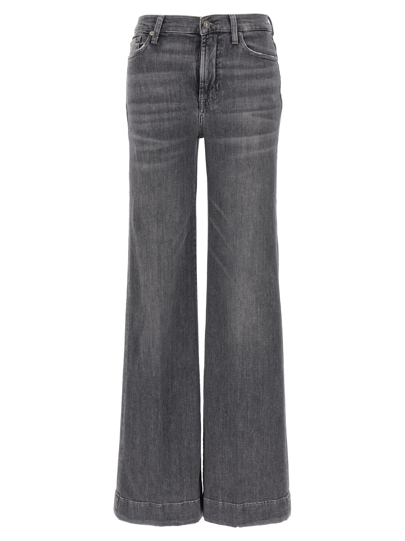 'Modern Dojo' denim jeans in japanese stretch delavé cotton, High waist and flared leg, zip and button closure, five pockets.