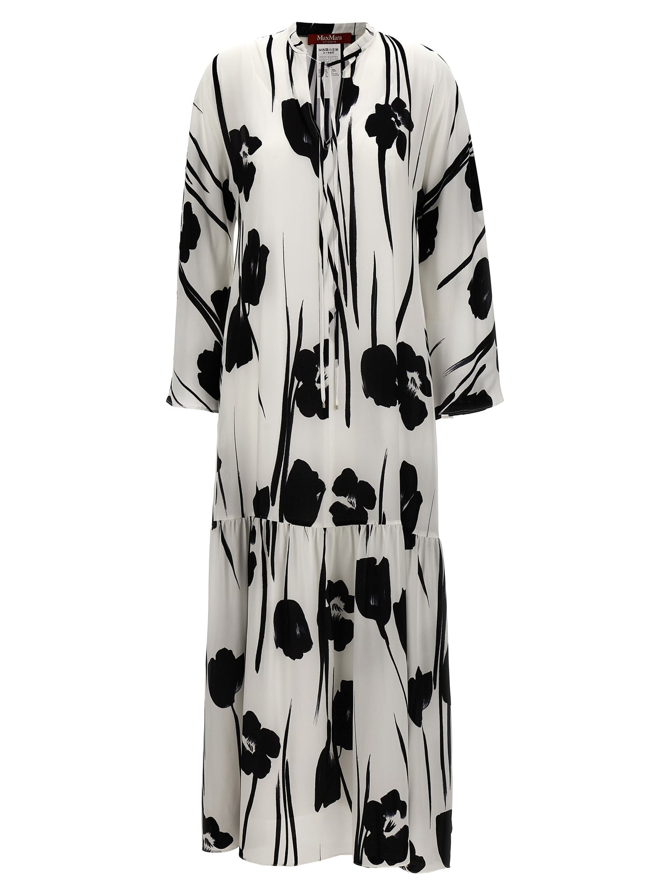 'Eles' floral print silk dress with drawstring neckline, long sleeves, flounce hem, matching removable petticoat.