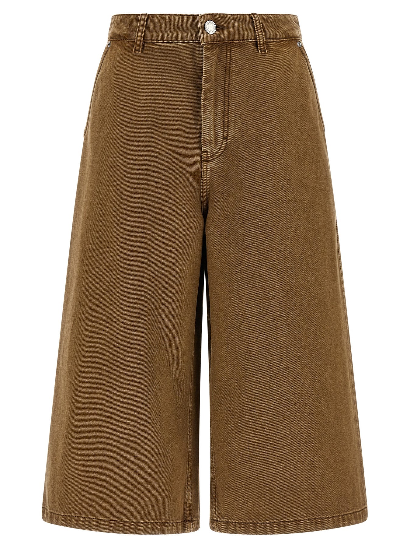 Garment-dyed cotton denim bermuda shorts with flared wide leg, front zip and button closure, five pockets, adjustable strap at the back.