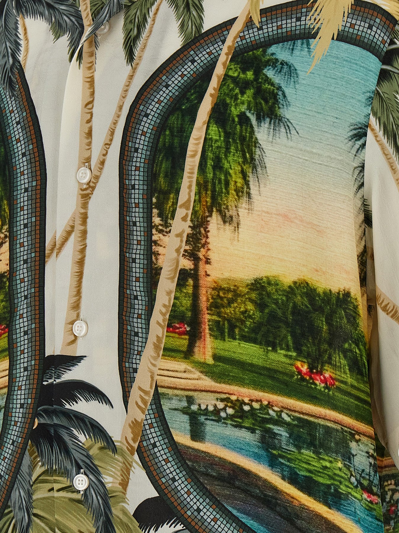 'Paradise Bowling' silk-effect fabric shirt with all-over print, V-neck style with resealable lapels with button, front button closure, short sleeves.
