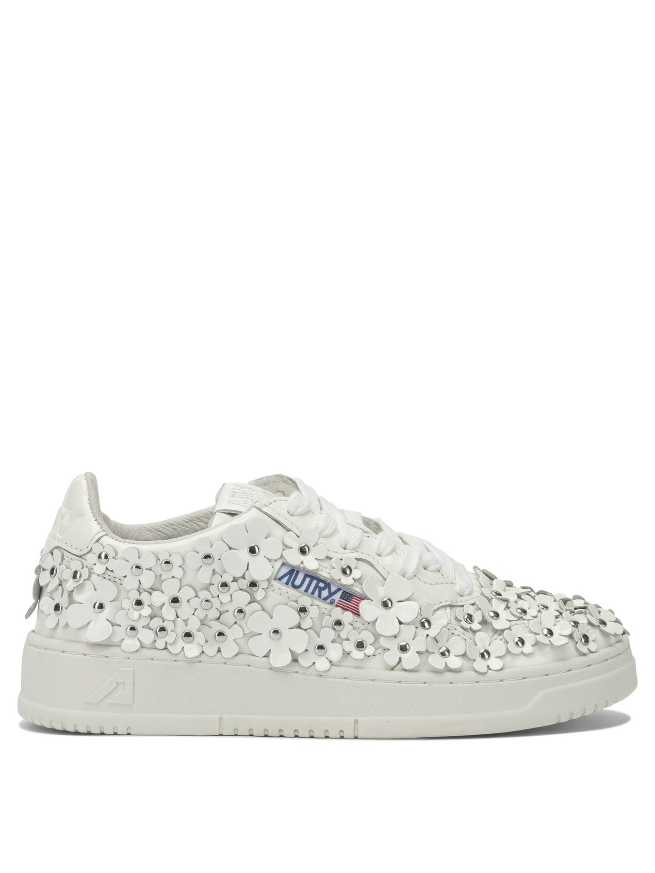 Autry "Medalist Low Blooming" sneaker with patent leather upper, low-profile construction and rounded silhouette. Cotton flat laces, embroidery label applied on tongue, matching jacquard logo. Padded collar and lining combine leather and cotton terry. Leather insole with 2 cm rise. Outer sole made of rubber, stitched texture for a clean, streamlined finish. || - Patent leather upper - Cotton flat laces - Label with embroidery stitched on the tongue - Padded collar - Leather and cotton terry lining - 2 cm raised leather insole - Rubber sole