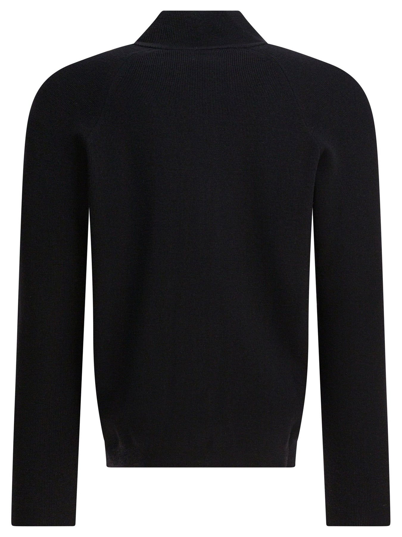 C.P. Company zippered sweater made of extra-fine 14-fine merino wool. The construction features a regular silhouette with raglan sleeves and a double-slider full zipper closure. A rubberized badge logo is applied to the lower left sleeve. The surface is uniform, featuring fine knit fabrication with no additional decorative details. || - Solid color - Long sleeves - Extra-fine merino wool - 14-gauge fine knitting - Double-slider full zipper closure - Rubberized badge logo on left wrist - Regular fit