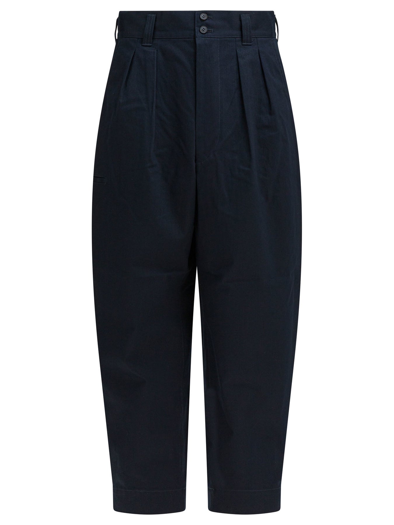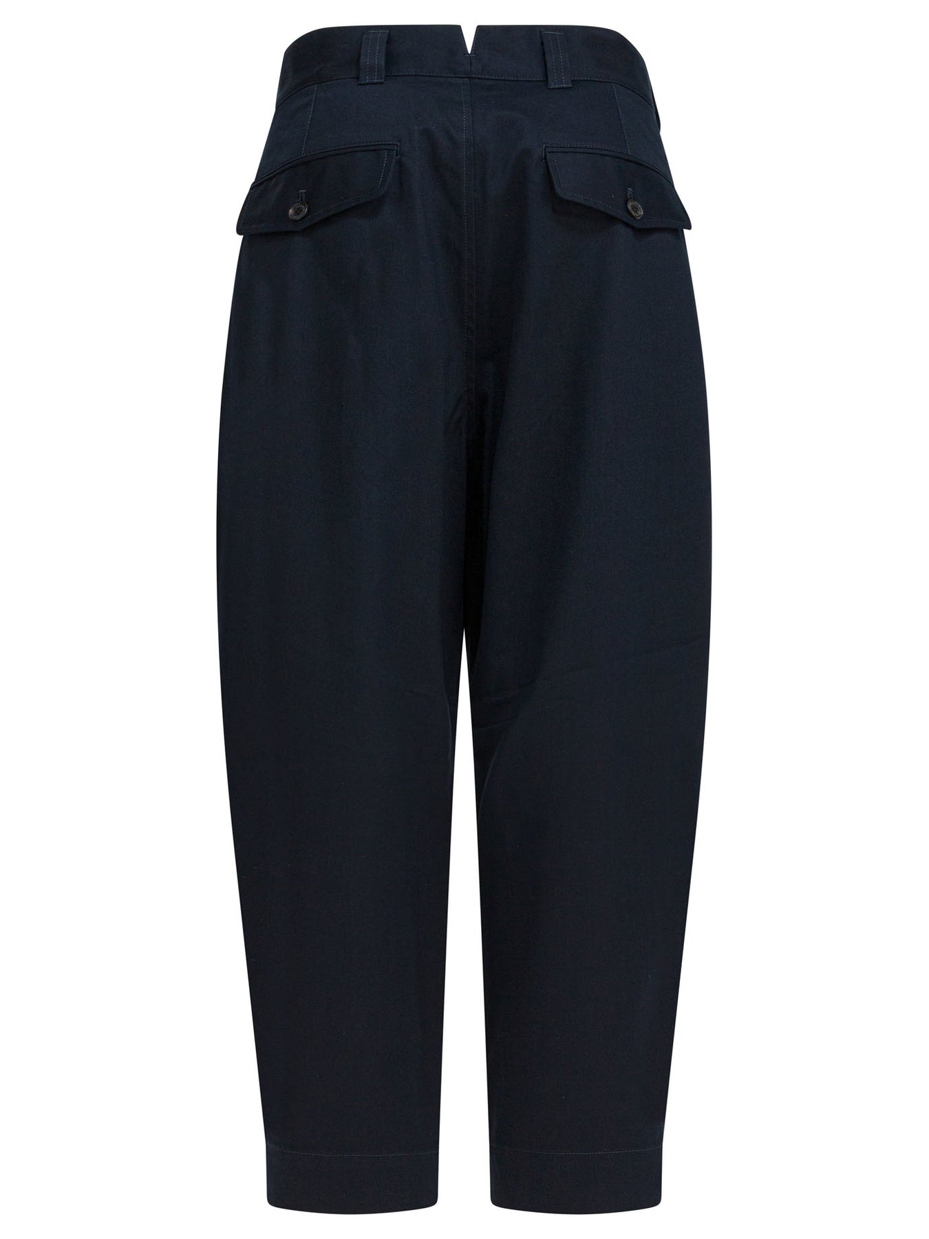 Comme Des Garçons Homme balloon pants, construction with a loose silhouette and voluminous structure at the top and tapered at the bottom. Made of tightly woven cotton, they feature a front button closure and belt loops. The seams follow regular lines and the design includes two side pockets and two back pockets with button closures, ensuring functionality and practicality in everyday wear. || - Solid color - High waist - Button closure - Belt loops - Two side pockets - Two back button pockets - Cotton - Relaxed fit