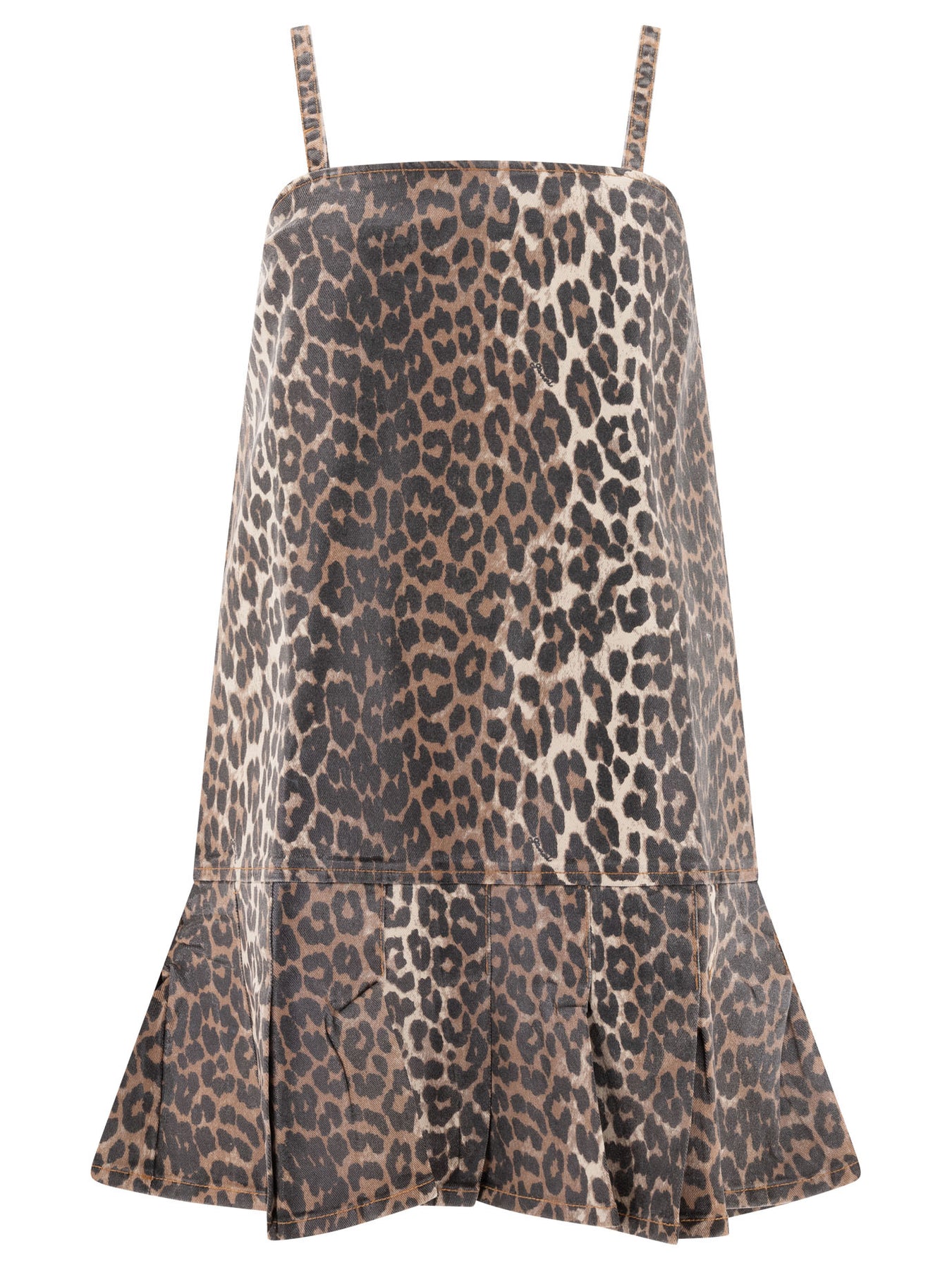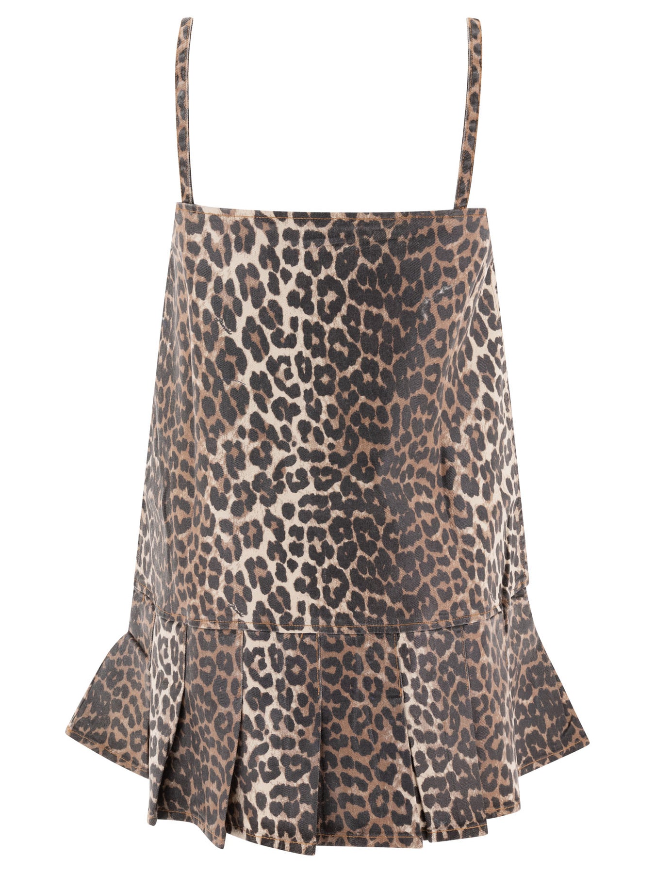 Ganni leopard dress made from lamé-effect fabric and animal print features a trapeze silhouette characterized by a square neckline and thin straps. The construction features a flared skirt with a pleated hemline that gives structure to the garment. The lines are sharp and the fit is regular, with finishing details that emphasize the essential cut and textural rendering. || - Animalier - A-line dress - Sleeveless - Square neckline - Thin straps - Pleated hemline - Lamé effect fabric - Flared skirt - Regular fit