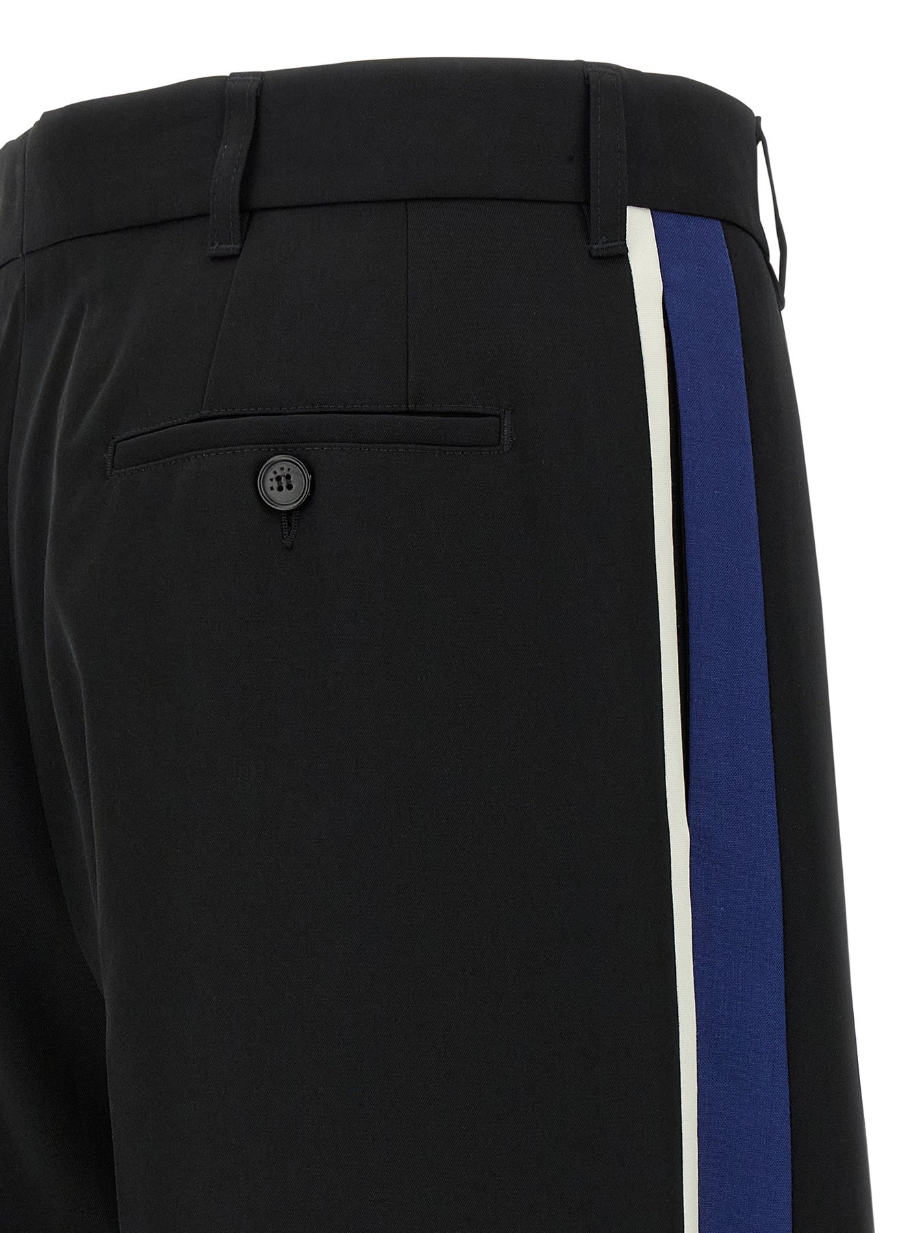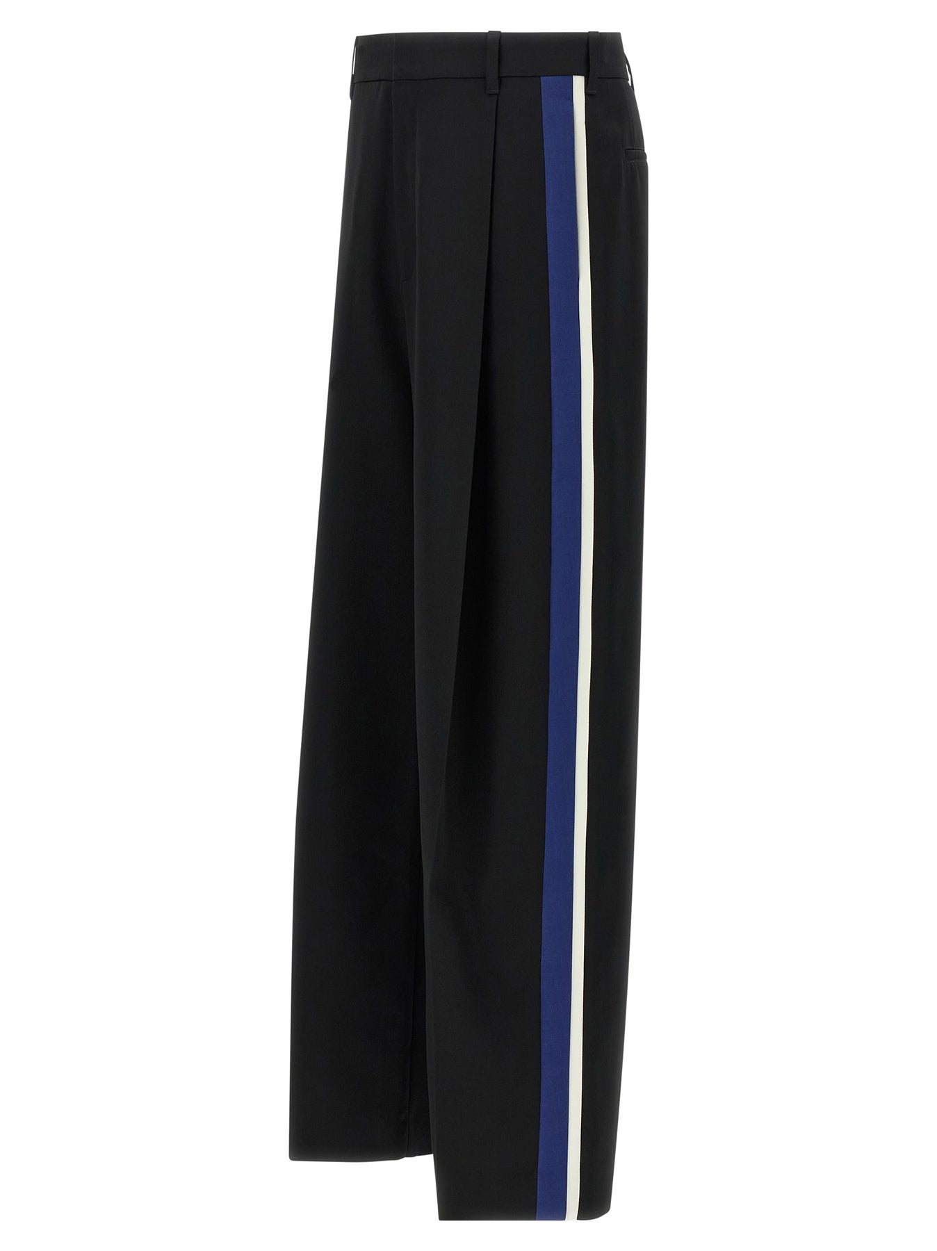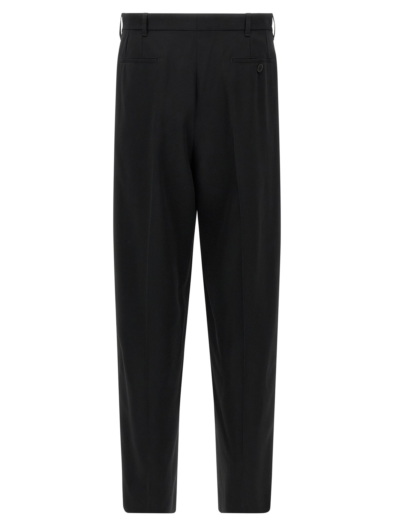 Wool trousers, classic straight leg with front stretched pleat, two-tone side bands, front zip and hook closure, pockets.