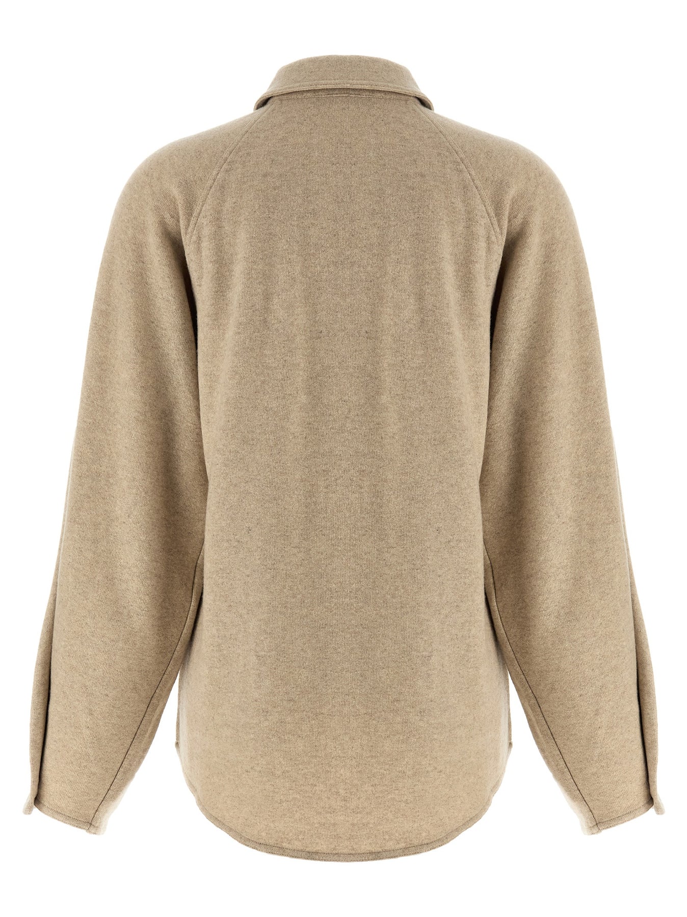 'Ceci' mélange stretch cashmere flannel overshirt, tone-on-tone logo embroidery and front button closure, long raglan sleeves with button and counter pleat on the hem, and asymmetric hem.