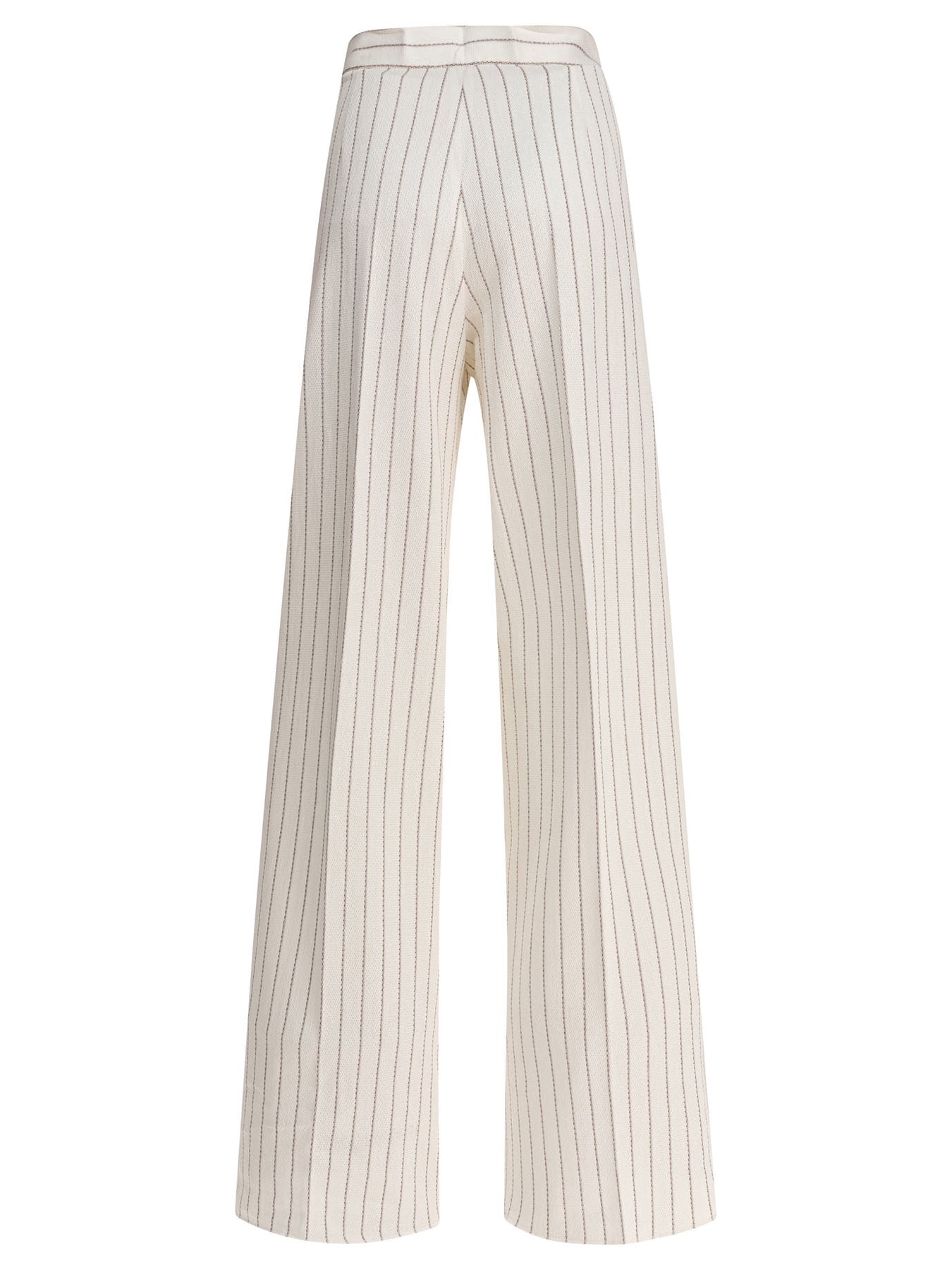 Max Mara's wide-leg trousers embody elegance and comfort in a garment that redefines oversize fit. Designed for the modern woman, these trousers feature a wide-leg silhouette with double front darts, ideal for any formal or casual occasion. The essence of pinstripes blends with a high waist for a sophisticated and timeless look. || - Double pleats on the front - High rise - Zipper and hook-and-eye closure - French pockets on the hips - Pinstripe effect stitching || Perfect to pair with a silk shirt and blazer for a professional look, or with a soft tee and long cardigan for a casual chic approach. Complete your outfit with leather accessories and mid-heel shoes.