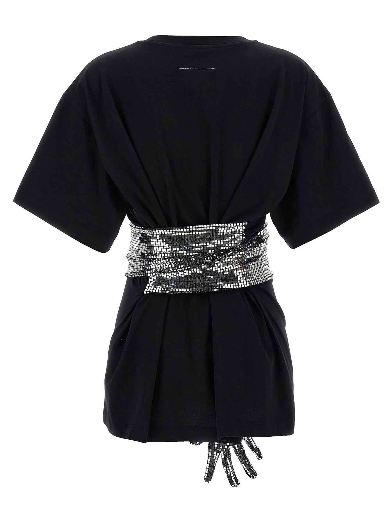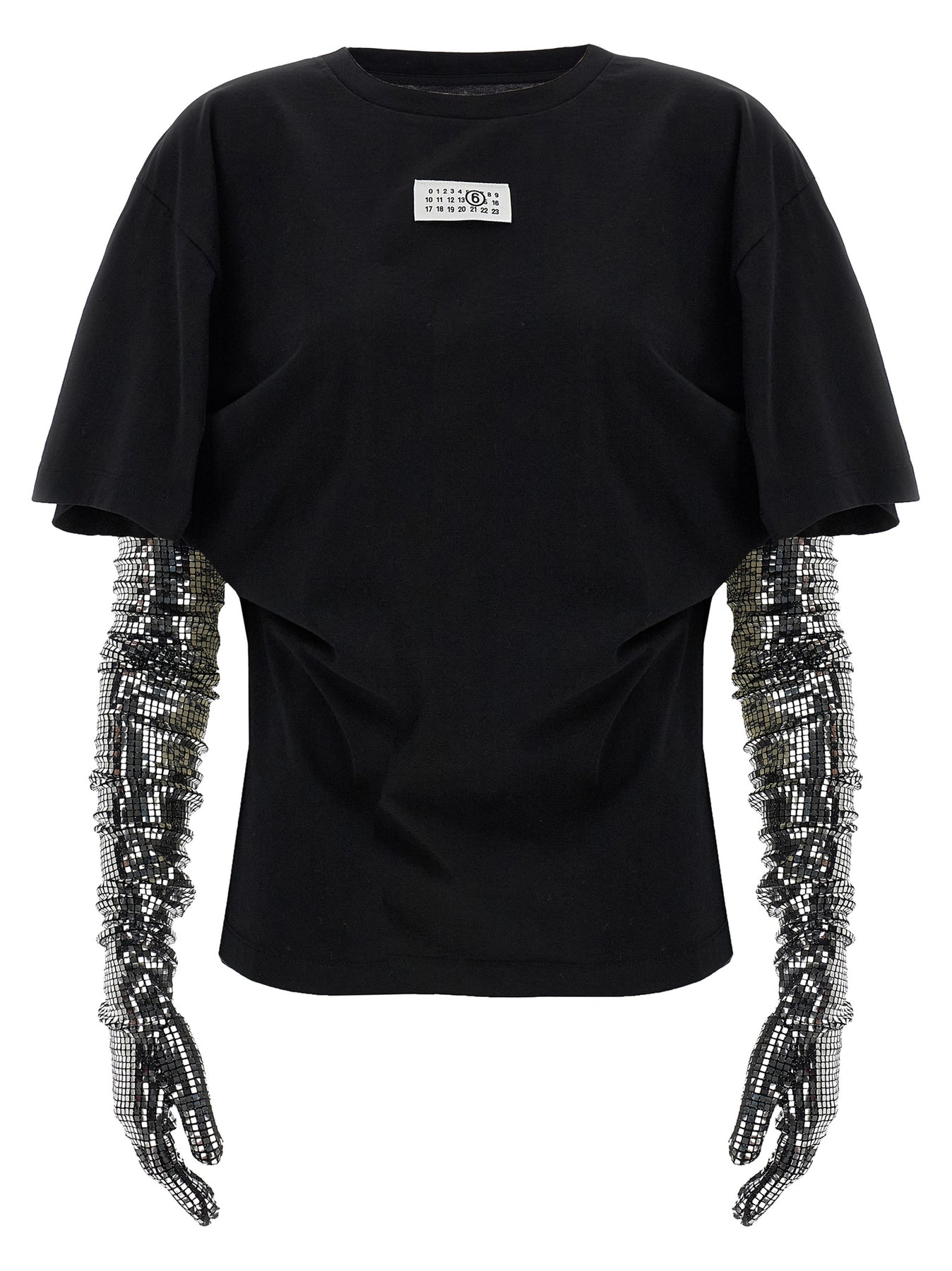 Cotton T-shirt with contrasting 'Numeric Signature MM6' front patch, crew neck, 'White Stitch Line' at the back, short sleeves and square sequin glove detail stitched at the waist. The garment can be worn as a classic t-shirt using gloves as a belt at the waist or letting short sleeves fall on the shoulders and using gloves as sleeves.