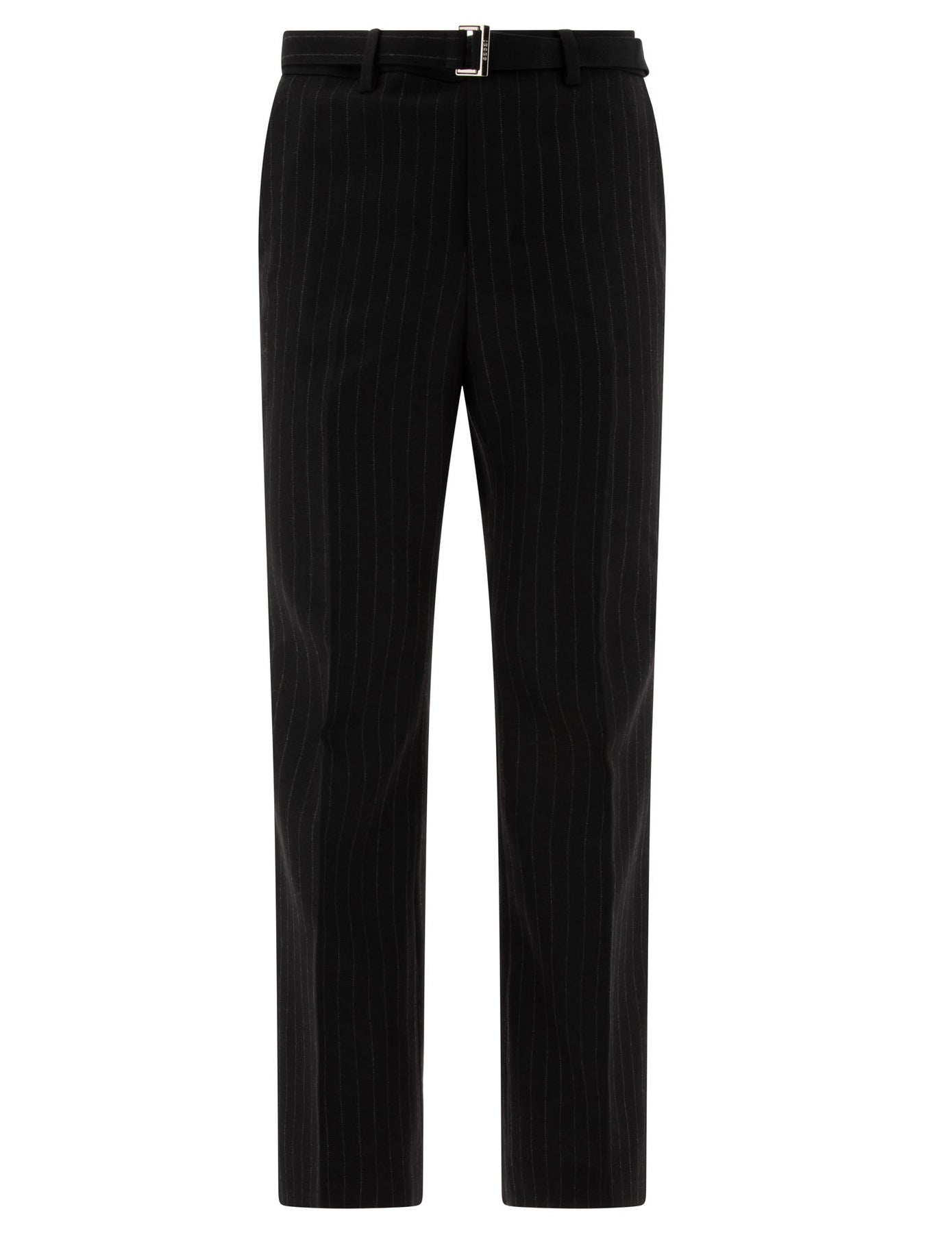 Sacai pinstripe pants combine elegance and comfort for the modern man. Featuring a regular fit, these pants are perfect for any occasion, offering distinctive style thanks to their subtle striped pattern. Ideal for those seeking a sophisticated look without sacrificing practicality. || - Regular fit - Zipper and button closure - Side and back pockets - Waistband - Mid-rise waist - Pinstripe || For a flawless outfit, pair these pinstripe pants with a tailored white shirt and a structured blazer. Complete the look with classic leather shoes and a stylish shoulder bag. This combination will ensure a touch of sophistication for any formal or professional occasion.