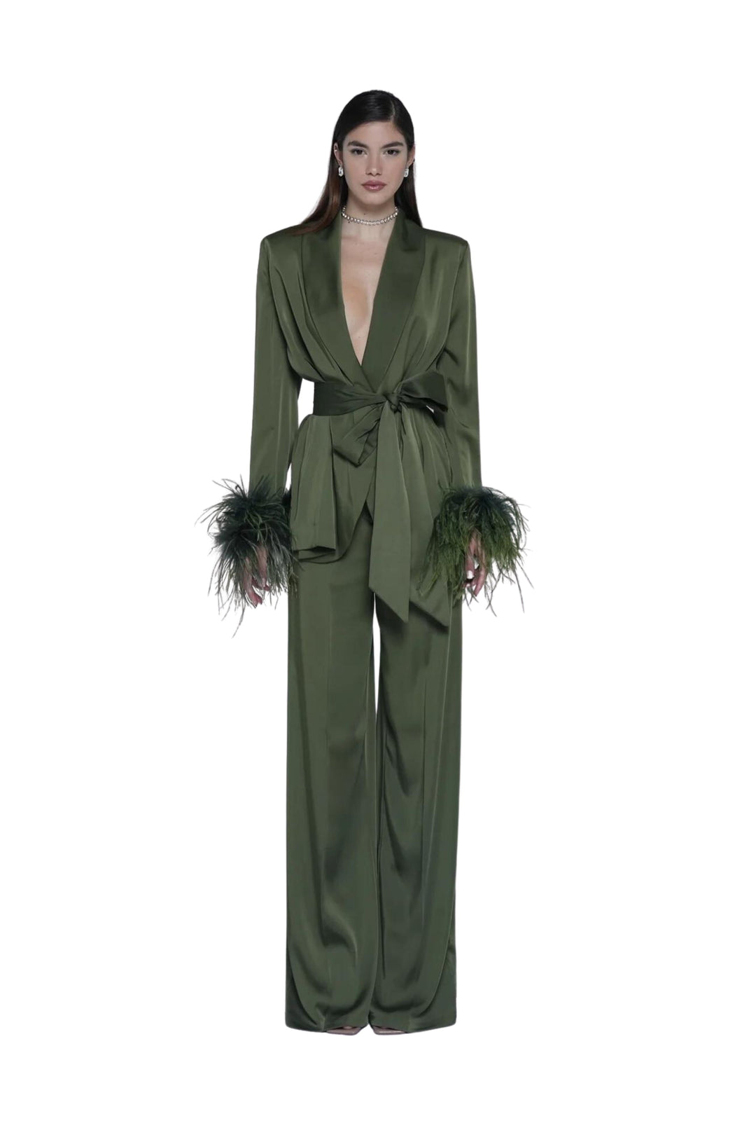 The Archivia tailleur green color. Jacket with removable belt. Pants with zip and hook closure. Cuffs with removable green feathers.