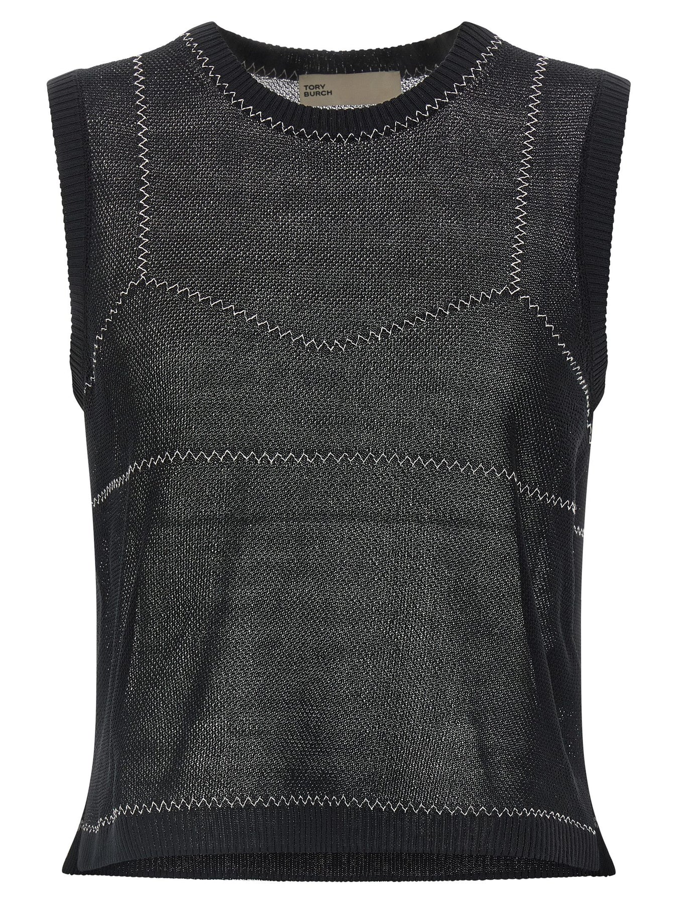 Semi-transparent mesh top, crew neck, sleeveless, contrast 'zig-zag' stitching detail.