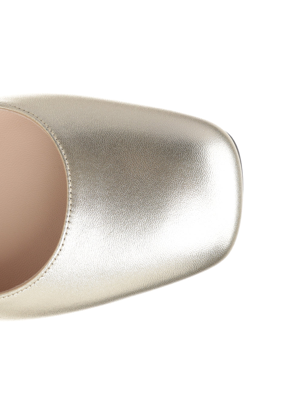 Mary Jane in silver-plated nappa leather with a Daisy jewel. Slim strap with a daisy-shaped jewel button — embellished with crystals and pink enamel with a gold “V” logo.