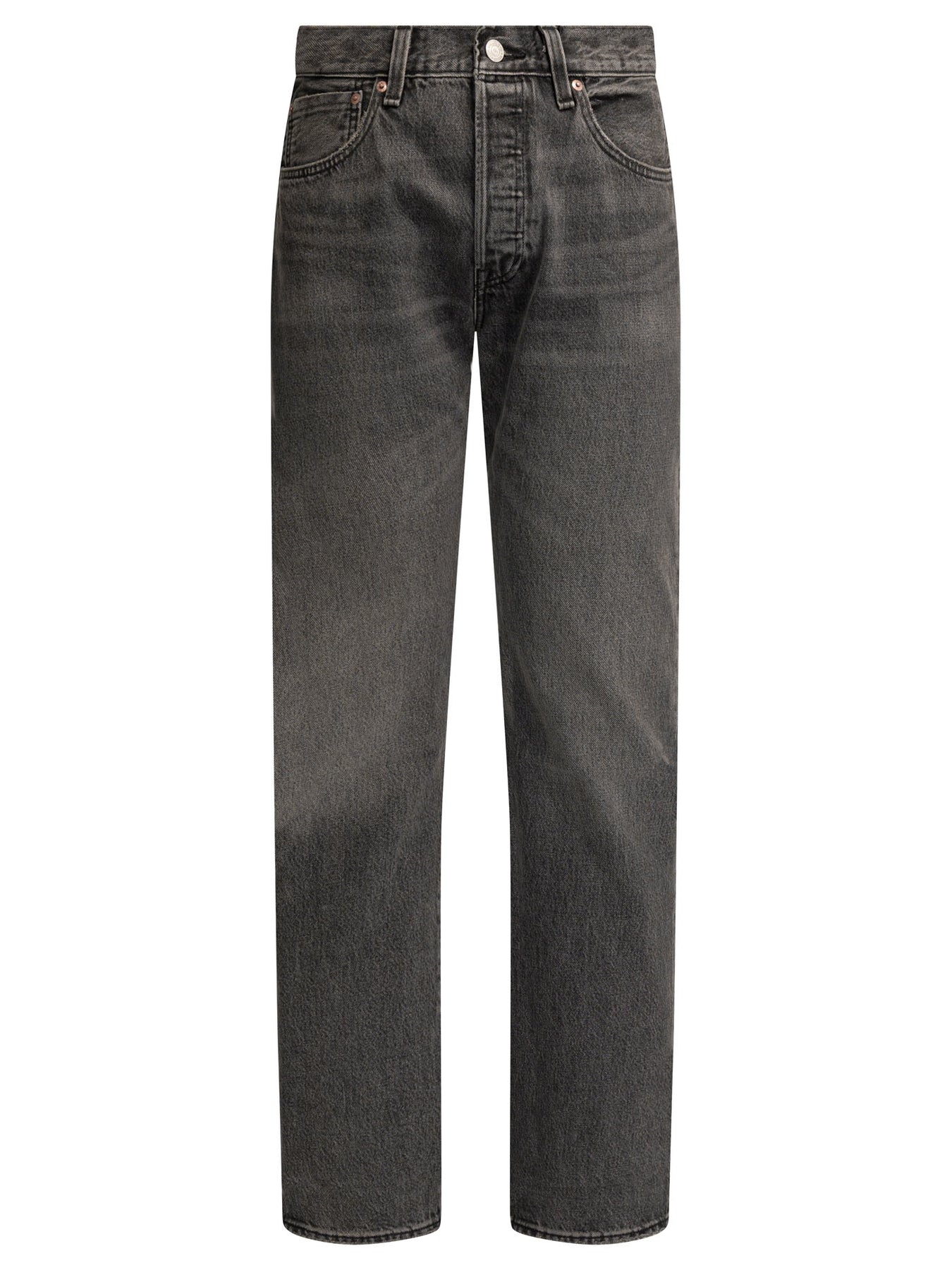 Levi's "501 Original" jeans made from selvedge denim, featuring a compact weave achieved on a traditional shuttle loom. The construction features a mid-rise waist and a straight line throughout, with sharp trim visible along the hemline. The silhouette follows an iconic construction with front button closure and five patch pockets, maintaining the historic cut introduced in 1873. || - Denim - Mid-rise waist - Straight line - Traditional shuttle weave - Hem finished with selvedge - Five pockets - Button closure - Relaxed fit