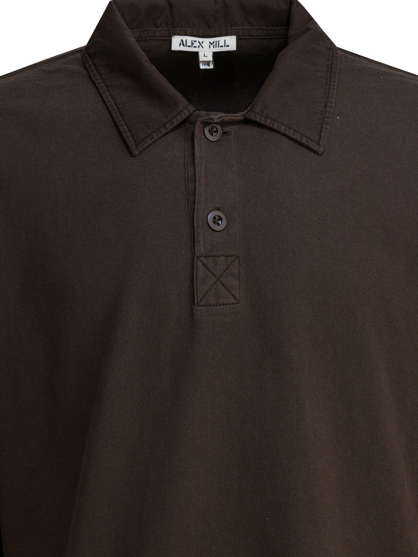 Alex Mill cotton "Rugby" polo shirt with structure made entirely of cotton. The garment-dyed construction emphasizes the natural texture of the fabric. The silhouette features slightly dropped shoulders and a squarer fit, lacking fit in the bust. The collar is constructed of cotton twill, and the inside flap uses a herringbone pattern that gives added strength and hold to the structure. || - Solid color - Long sleeves - Washed for a compact surface - Herringbone cotton inner flap - Cotton twill collar - Slightly dropped shoulders - Relaxed fit