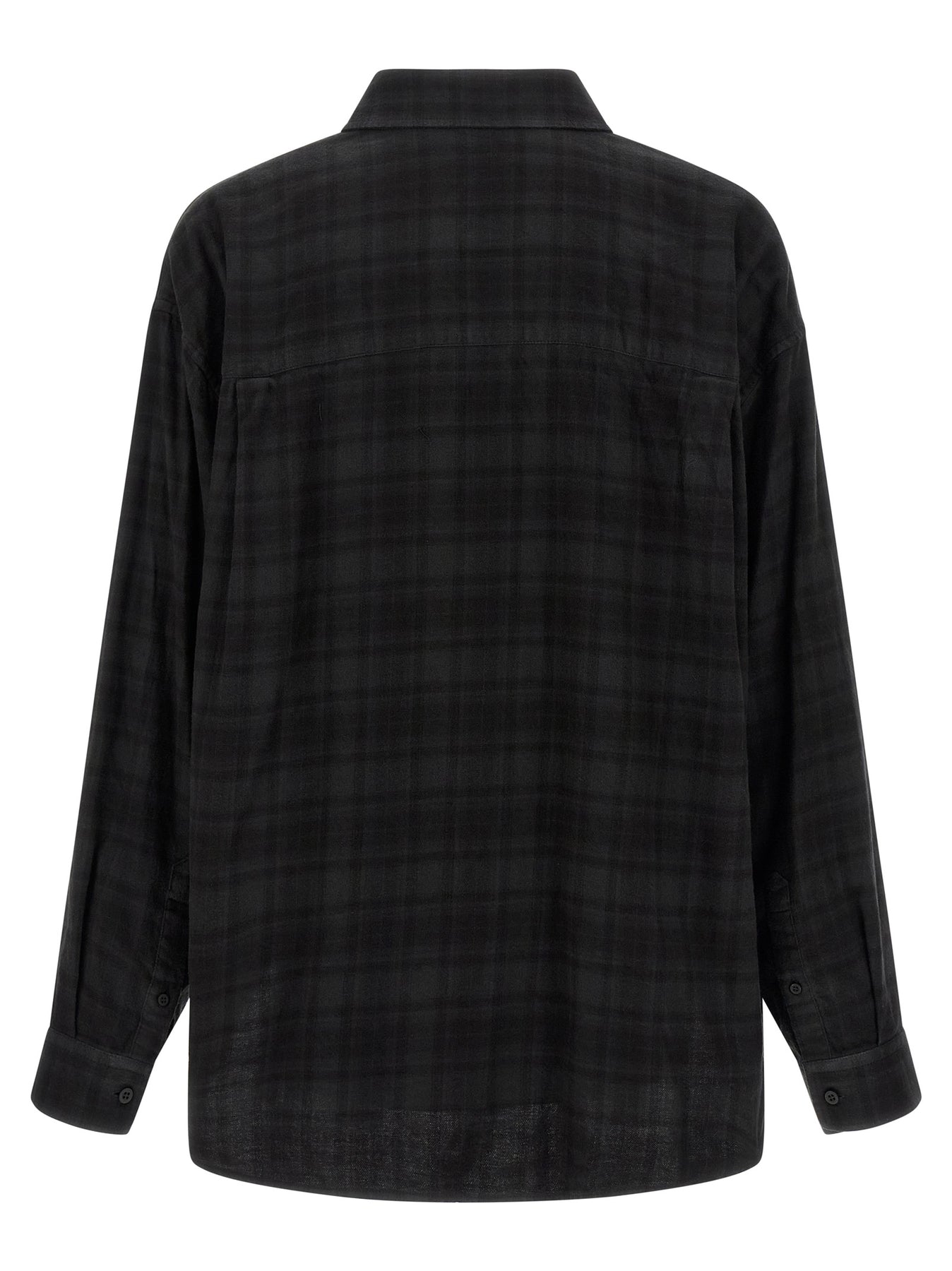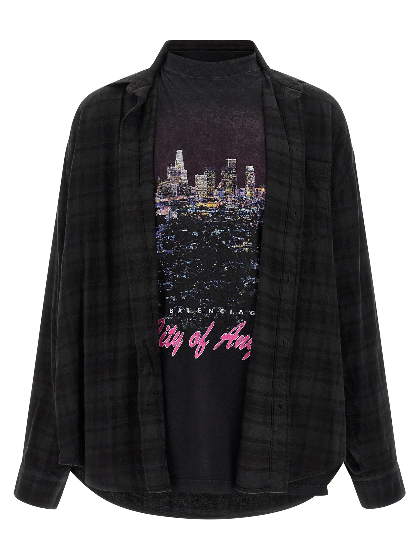 Check poplin cotton shirt and dry jersey t-shirt with front 'City of Angels' print, trompe l'œil layered effect construction, front button closure, breast pocket, long cuffed sleeves and dropped shoulder.