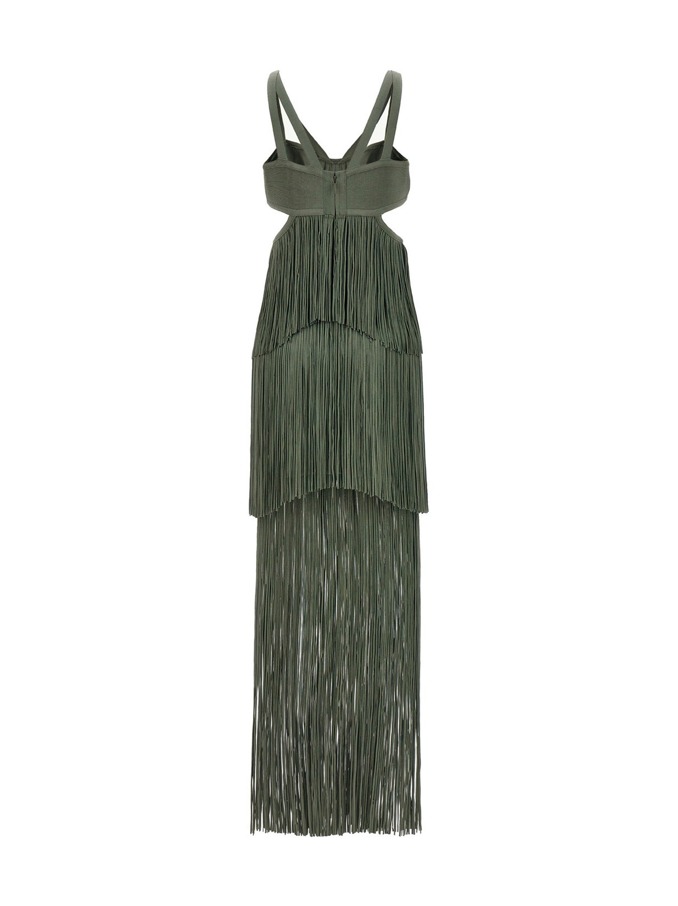 Strappy Tiered Fringe' knit dress with ll-over fringed appliqué, V-neck, cut-out details, thin straps and a back zip closure.