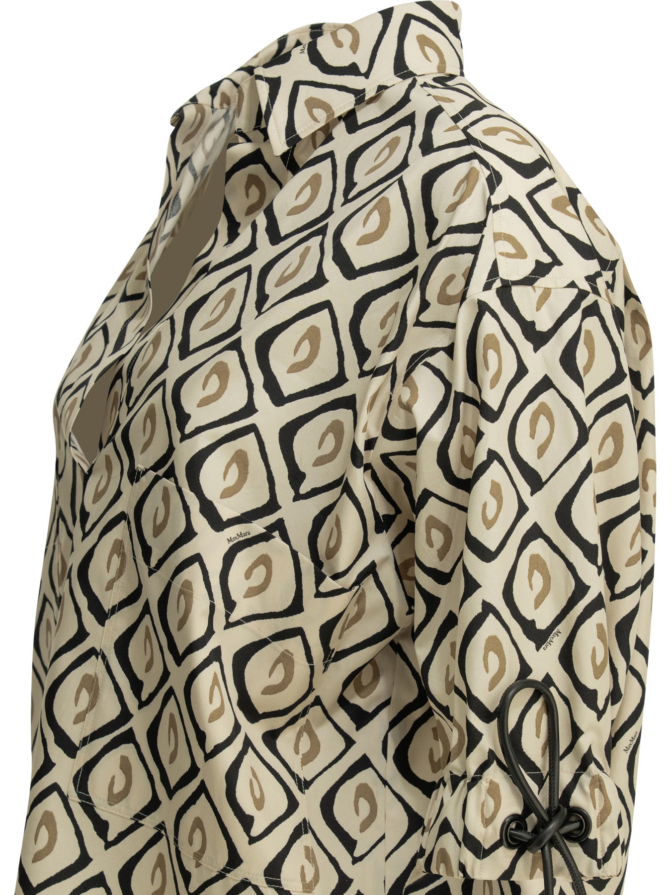 Max Mara printed cotton casual shirt constructed of cotton poplin with pattern throughout. The construction features an oversized silhouette, elbow-length sleeves with dropped shoulders, and high cuff adjusted by tubular leather drawstring. The polo-style collar is open at the front, with patch pockets applied to the chest. On the back, sprone cut with symmetrical pleats and longer asymmetrical bottom. || - All-over print - V-neck at the front - Elbow-length sleeves with dropped shoulder - High cuff with leather drawstring. - Patch pockets patch on chest - Sprone cut and symmetrical pleats at back - Asymmetrical longer hem at back - Printed pure cotton poplin - Oversize fit
