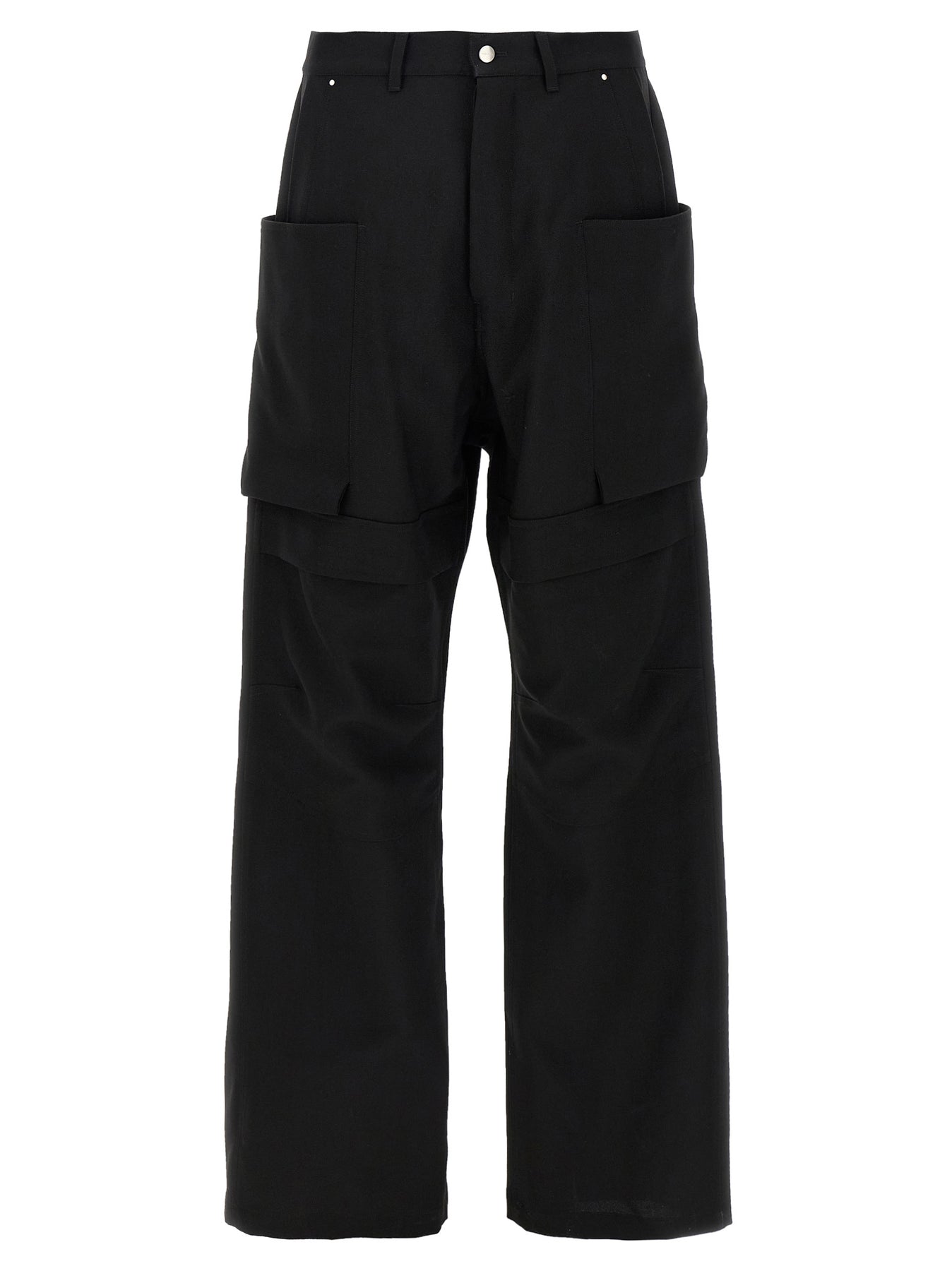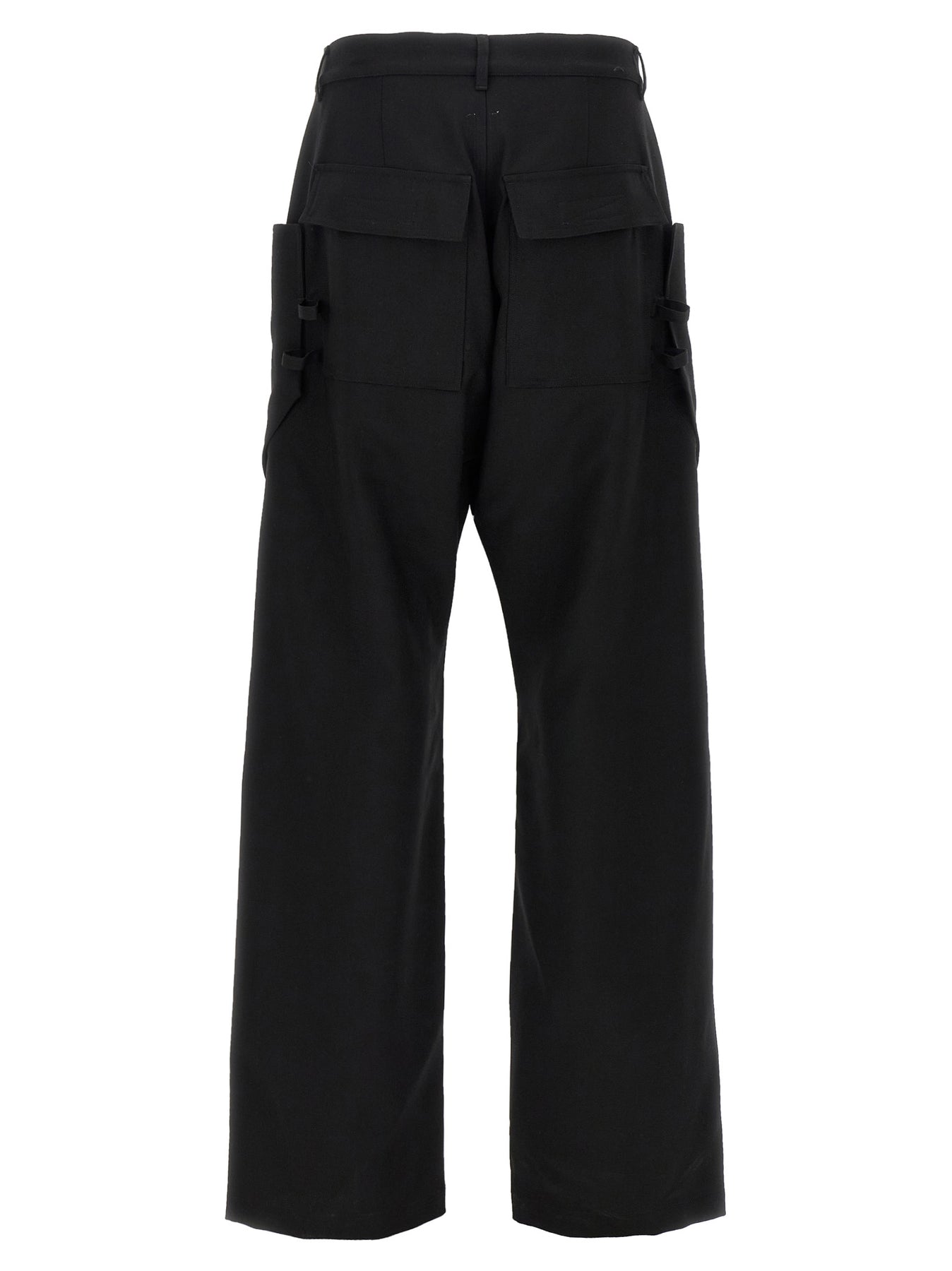Stefan Cargo' virgin wool trousers, side cargo pockets, low crotch model, front button closure, wide and straight leg, pockets.