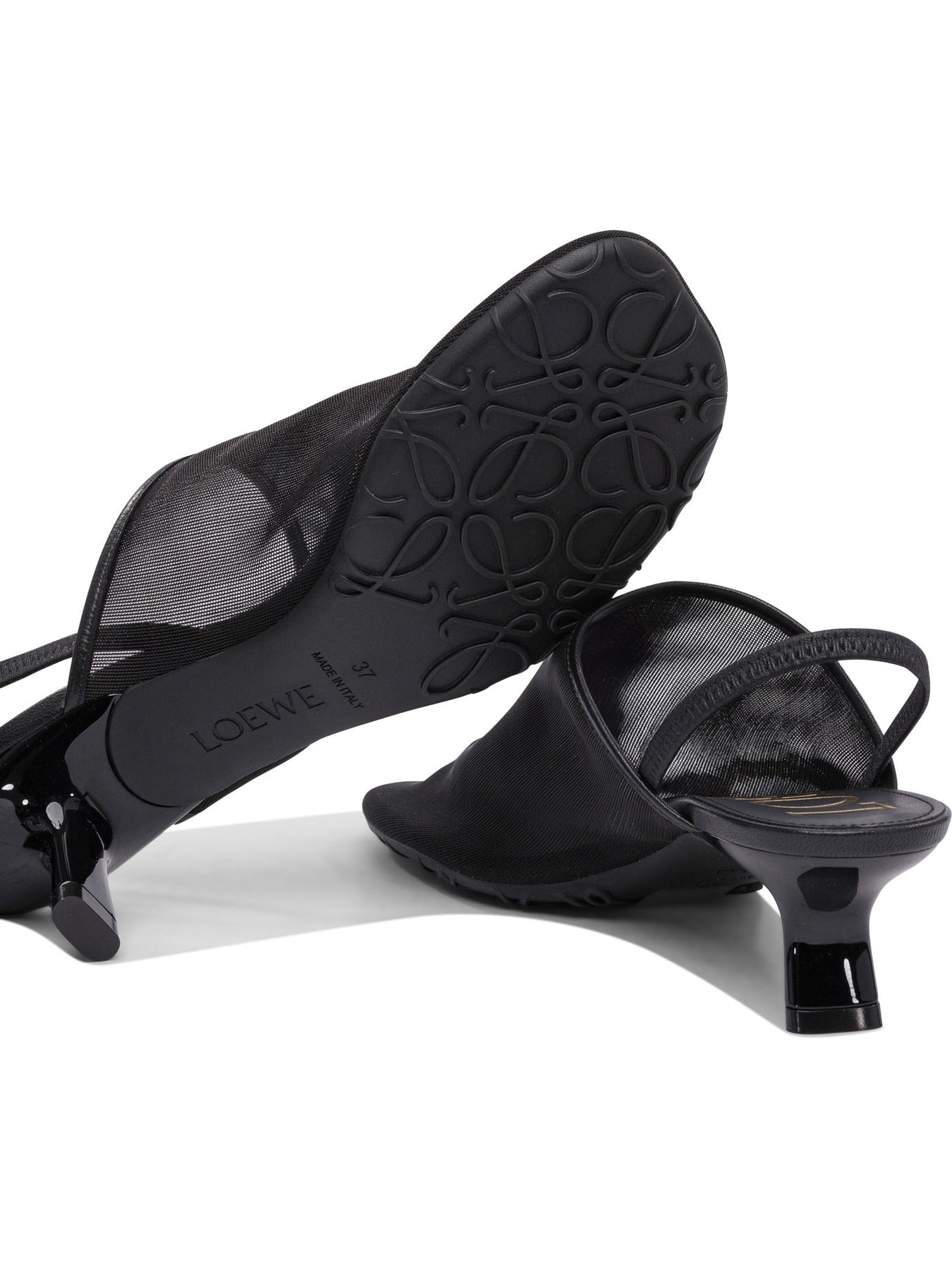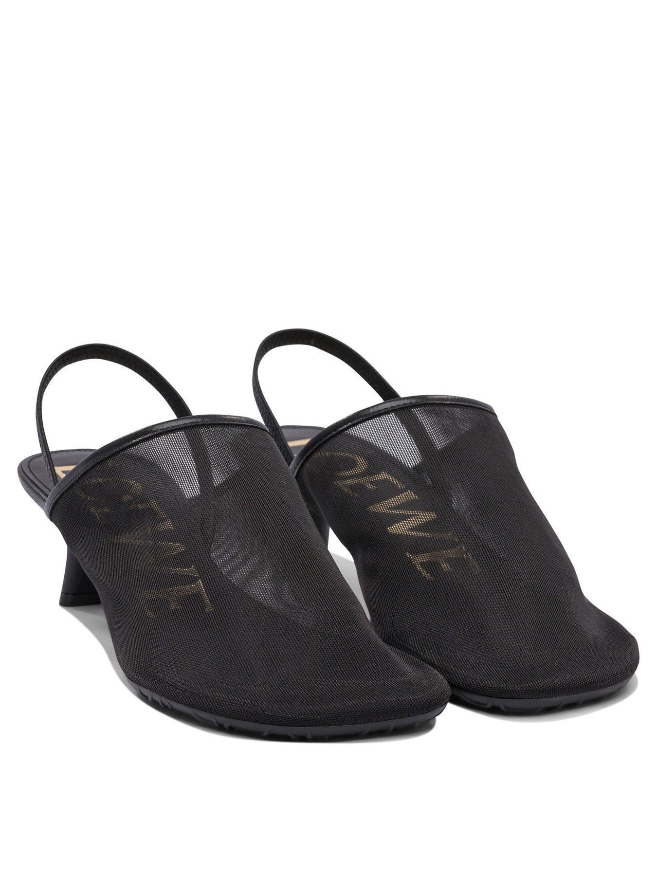 Loewe's 45mm "Petal" mules represent a perfect blend of elegance and sophistication. Designed for women who appreciate sophisticated style, these mesh slingback heeled sandals offer a unique design that catches the eye, making every step an unforgettable moment of style. || - Petal mule with slingback heel - Glossy lacquered angled heel - Rubber sole with embossed Anagram pattern - Heel height: 45 mm || For a flawless look, pair these mules with a flowing summer midi dress or pleated skirt. Also perfect with a sleek blazer and loose pants for a sophisticated and elegant outfit. Complete the ensemble with a refined clutch for a special night out.