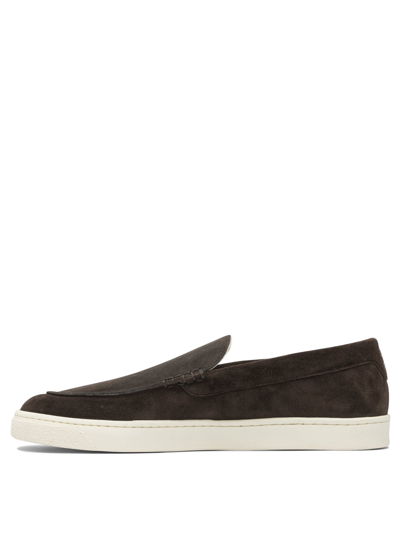 Brunello Cucinelli chevron-effect suede moccasins, crafted from suede leather with a velvety hand-feel surface. Upper features a classic low-cut silhouette, characterized by lightweight construction. Internal structure with leather lining and reinforced edge designed for grip and stability. Natural latex outsole adds flexibility and cushioning, complementing the shoe with a durable rubber base. || - Chevron-effect suede upper - Leather lining - Natural latex outsole with rubber tread pattern
