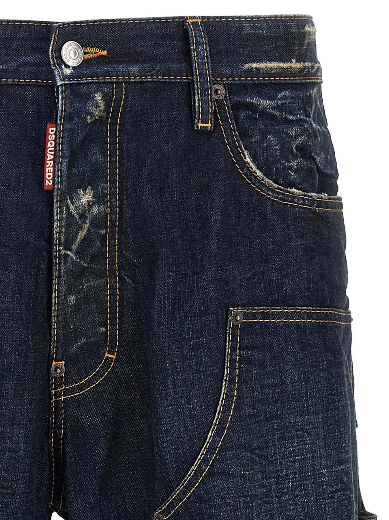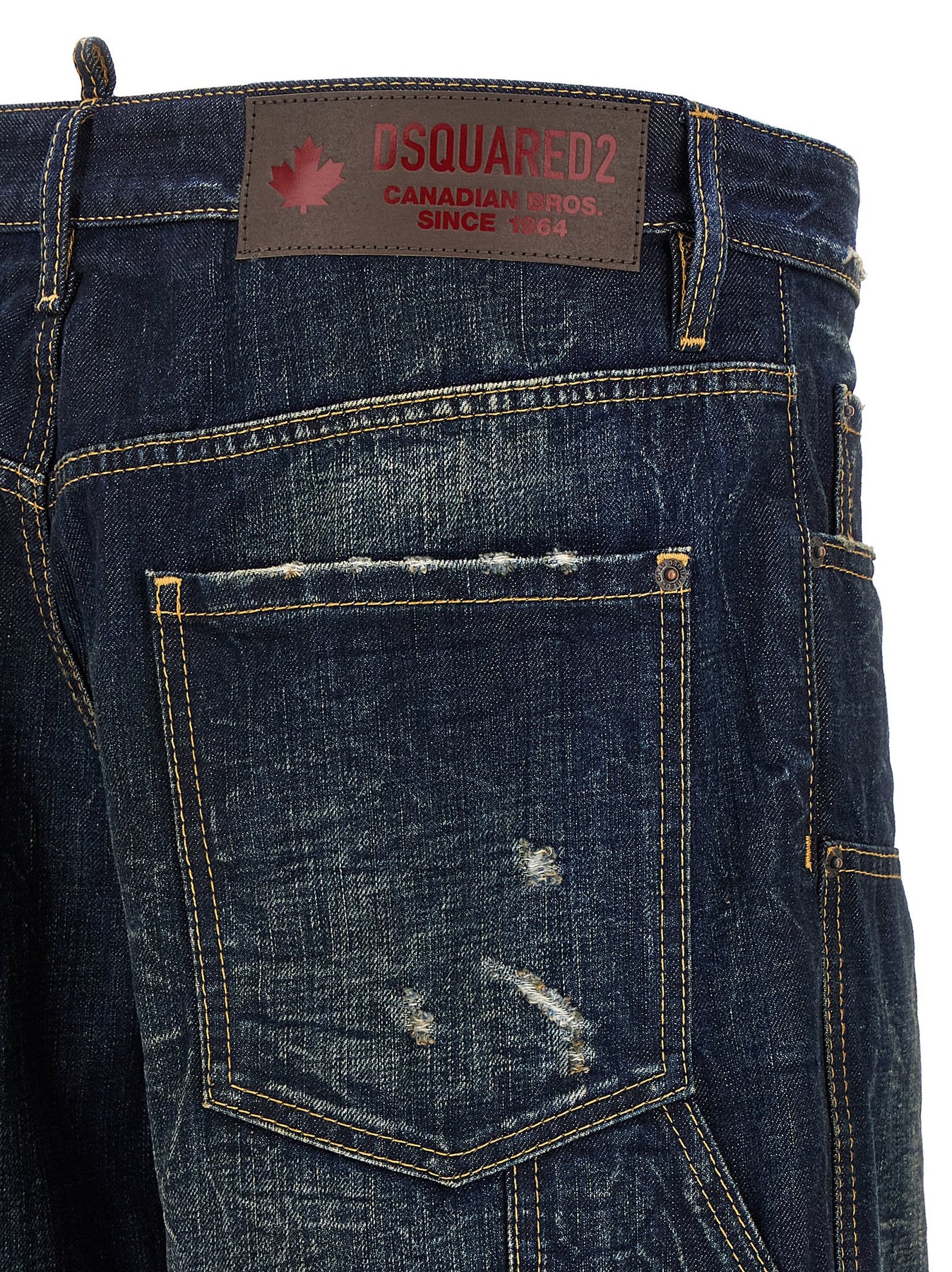 'Loose Carpenter' cotton denim jeans with dusty distressed treatment, contrast stitching, front button closure, vintage-effect metal charm with front logo embroidery, straight leg, back leather logo tag.