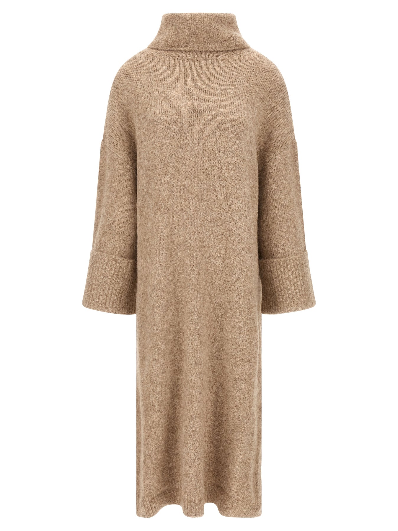 'Manhattan' alpaca knit midi dress with turned-up high neck, long wide sleeves with turned-up cuffs and dropped shoulders